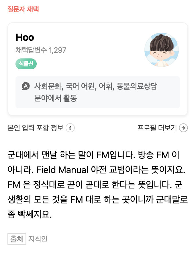(...) 첫째가 ‘FM대로 한다’는 말이다. 이 말 뜻은 대체로 정석대로 한다는 뜻인데, 전형적인 군사용어이다. 미군이 사용하는 야전교범(Field Manual)의 약자인데, 정석대로 원리원칙을 지키며 무언가를 하는 것을 이르는 말이다. 일상 생활에서 사용할 낱말은 아니다.(..)