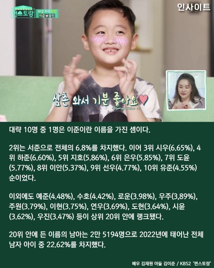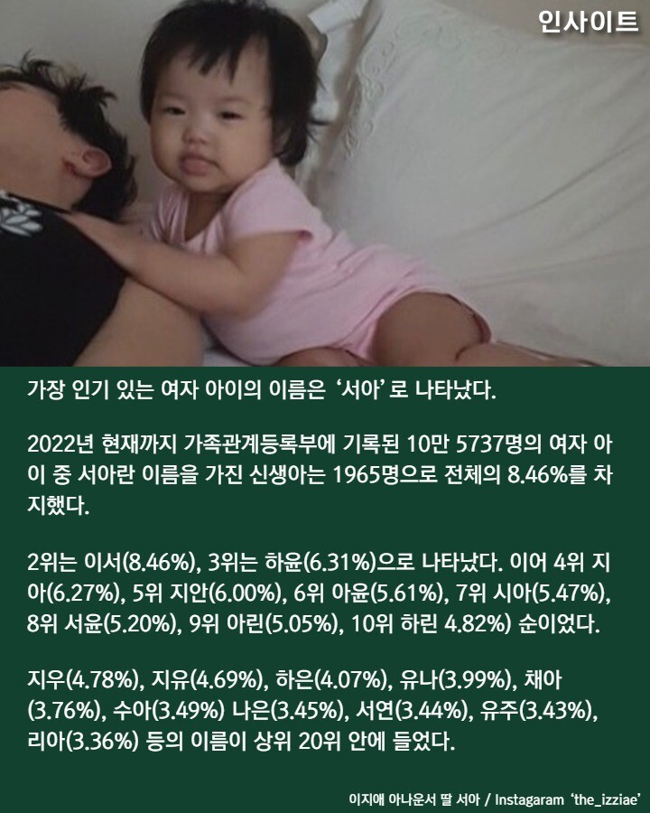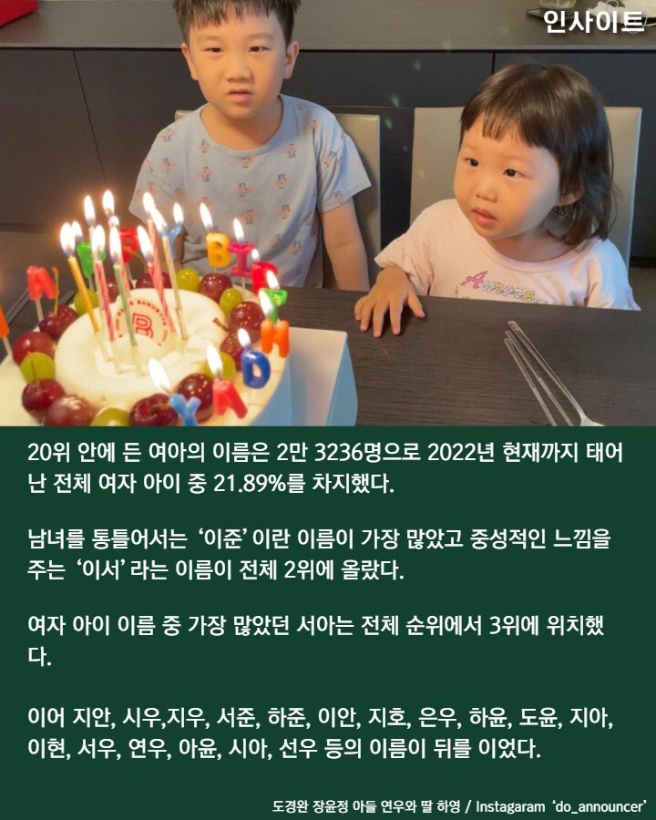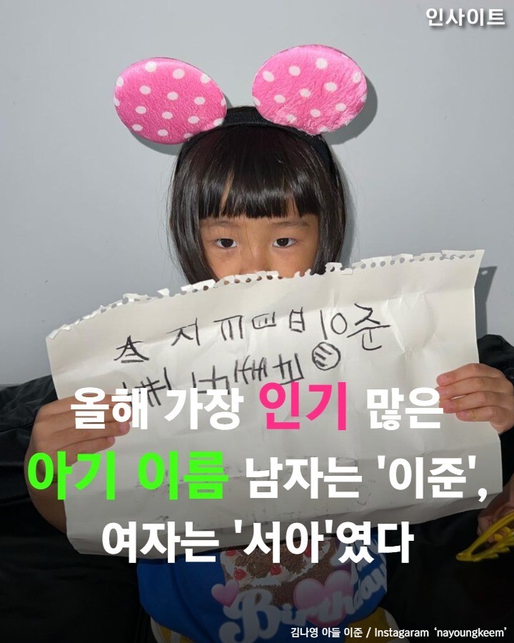 [여시뉴스데스크]올해 가장 인기 많은 아기 이름 남자는 '이준', 여자는 '서아'였다 작성자겟백|작성시간22.10.21|조회수4,165 목록 댓글 17 글자크기 작게가 글자크기 크게가 출처 : https://www.instagram.com/p/Cj-PPC8tz1O/?igshid=YmMyMTA2M2Y= 다음검색 현재 게시글 추가 기능 열기 북마크 공유하기 신고 센터로 신고 댓글 댓글 17 댓글쓰기 답글쓰기 댓글 리스트 작성자아까비깡 | 작성시간 22.10.22 헐 10명중1명이 이준??흔하게 안짓고 싶지 않나?ㅜㅜ 나랑 이름 똑같은 사람 있으면 싫던데.. 작성자분노조절못하는여시 | 작성시간 22.10.22 애기들 이름이 똥글똥글하니 귀여워 ㅋㅋㅋ 작성자Xbhk | 작성시간 22.10.22 내 조카도 이준 ㅋㅋㅋㅋㅋㅋ 작성자잠이너무많아큰일이군 | 작성시간 22.10.22 친구딸5명중 4명이 다 서아야..... 작성자우와우우 | 작성시간 22.10.22 맞아 이준이 두명이나있어 댓글 전체보기