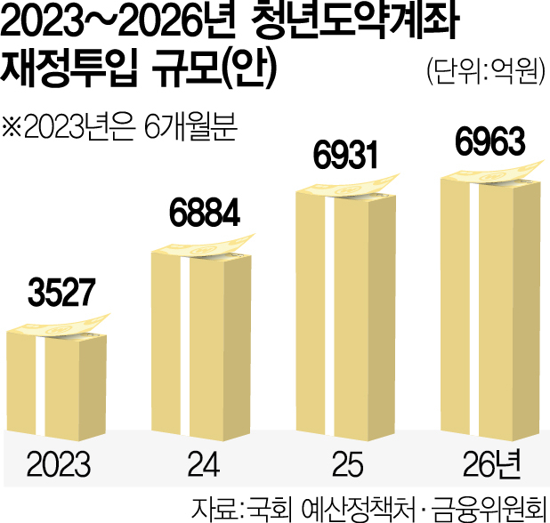 27일 국회 예산정책처와 금융위원회 등에 따르면 정부의 2023년도 예산안에는 청년도약계좌 출시·지원과 관련해 서민금융진흥원 출연금 3527억 7200만 원이 신규 편성됐다. 구체적으로는 본인 납입금에 대한 기여금 지원 3440억 3700만 원, 가구 소득 심사 시스템 구축·운영 및 서민금융진흥원 내 소득 심사 센터 설치·운영 등 인프라 구축 85억 8100만 원, 청년도약계좌 제도 운영 지원 1억 5400만 원 등이다. 연도별로는 △2024년 6884억 4600만 원 △2025년 6931억 5200만 원 △2026년 6963억 8100만 원 등이다. 중기(4년) 예산 계획에 포함되지 않은 2027년을 연평균인 7000억 원가량으로 추산하면 가입 기간인 2023~2027년 5년간 3조 원 이상이 소요될 것으로 전망된다.