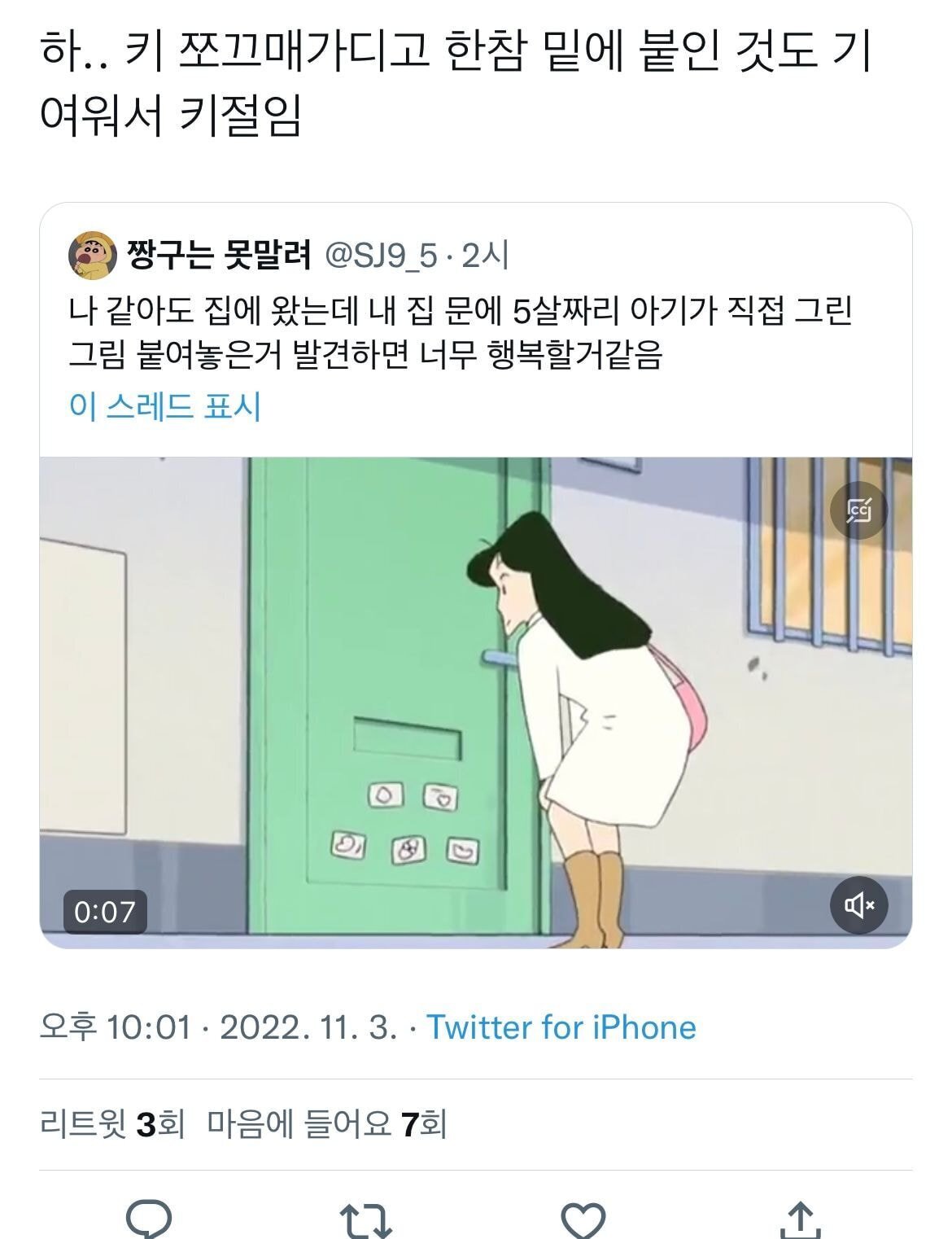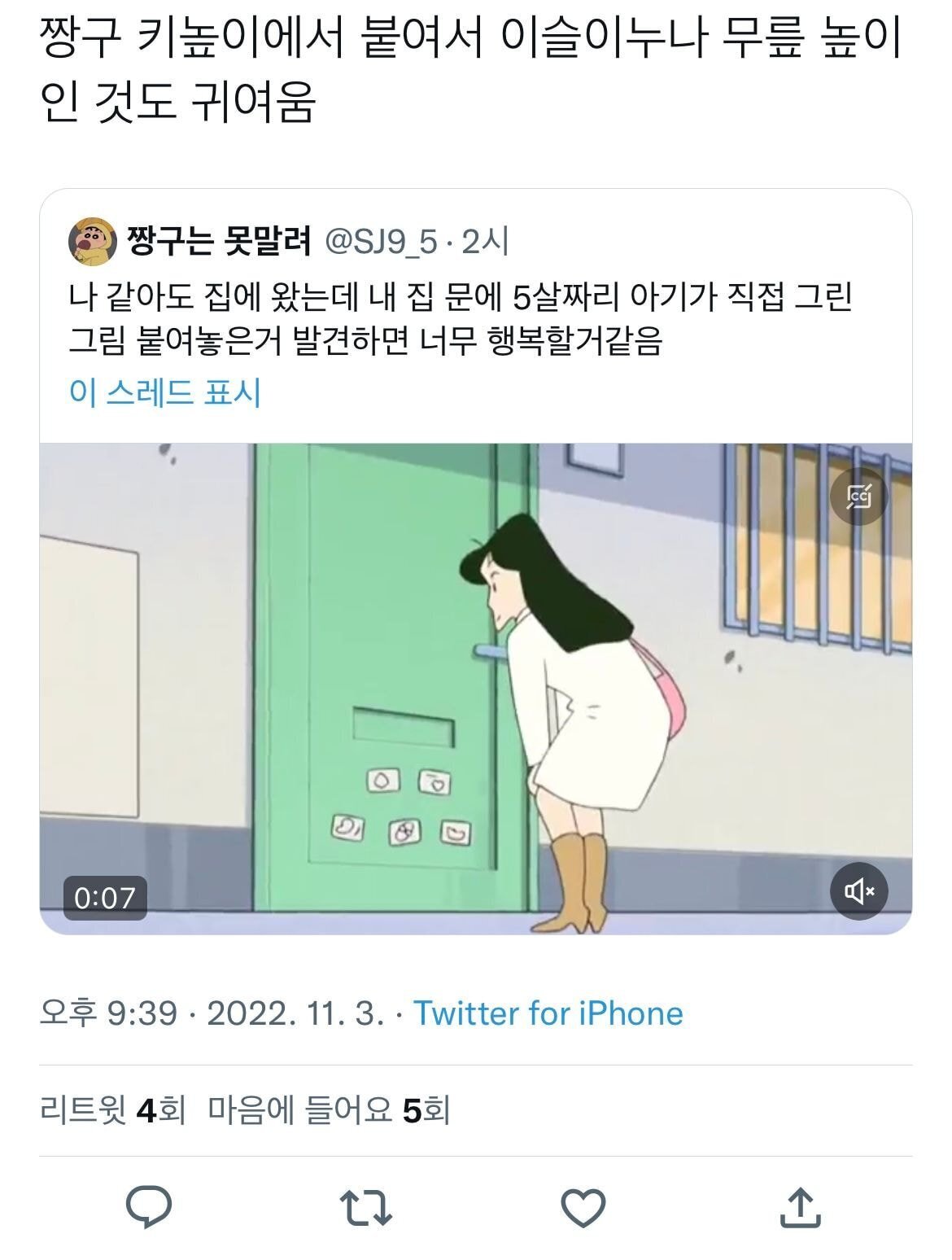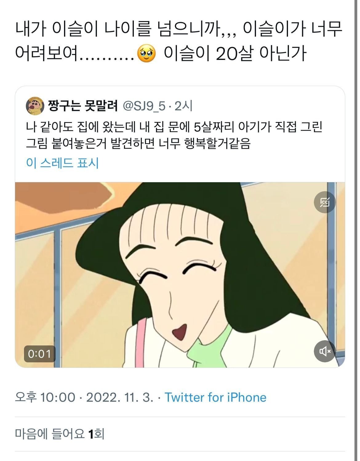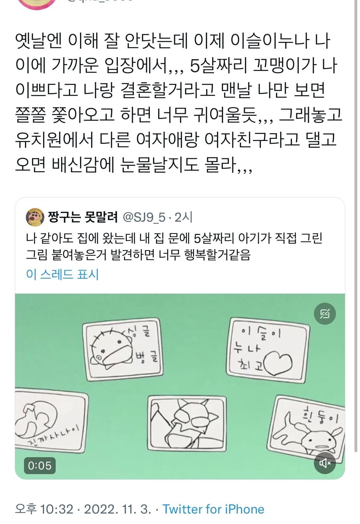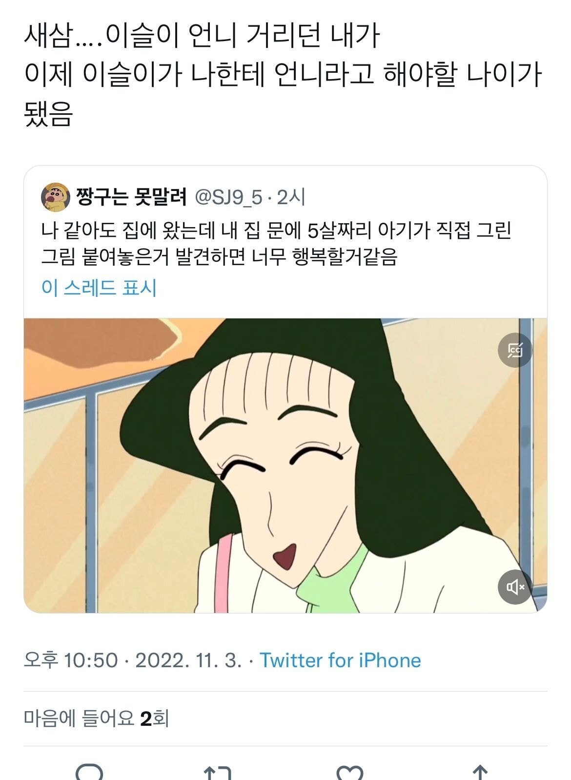 [흥미돋]이제는 이해가 확 되는 짱구는 못말려 장면.twt (feat.이슬이누나) 작성자조우정|작성시간22.11.03|조회수19,148 목록 댓글 27 글자크기 작게가 글자크기 크게가 출처 : https://theqoo.net/2627719098 https://twitter.com/sj9_5/status/1588128586967371776?s=46&t=QNElQz30xqYc9gmqMuk3cQ 다음검색 현재 게시글 추가 기능 열기 북마크 공유하기 신고 센터로 신고 댓글 댓글 27 댓글쓰기 답글쓰기 댓글 리스트 작성자앨리 추 | 작성시간 22.11.04 그러네 이슬이 입장에서 보면 얼마나 귀여울까… 작성자프로필 포기화 | 작성시간 22.11.04 이슬이가 받아주는 것도 이해 간다 ㅋㅋㅋㅋ 작성자뚝배기깨버린다 | 작성시간 22.11.04 내가알기론 이슬이 97년생으로 알고잇슴ㅋㅋㅋ 작성자watuwnt | 작성시간 22.11.04 밑에잇는거 진짜 존귀다 작성자김연경백노바허휘수 | 작성시간 22.11.04 봉미선이 나한테 언니라해야됨........ 댓글 전체보기