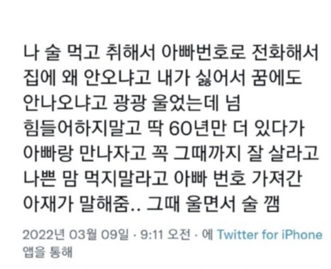 [눈물한방울]나 술먹고 취해서, 돌아가신 아빠번호로 전화함 작성자Brookeshields|작성시간22.11.05|조회수191,080 목록 댓글 38 글자크기 작게가 글자크기 크게가 출처 : 여성시대 Brookeshields 다음검색 현재 게시글 추가 기능 열기 북마크 공유하기 신고 센터로 신고 댓글 댓글 38 댓글쓰기 답글쓰기 댓글 리스트 작성자달밤의꽃 | 작성시간 22.11.06 ㅠㅠ... 작성자ㅎㅁㄴㅁ | 작성시간 22.11.06 비상.. 작성자허니잼 | 작성시간 22.11.06 ㅠㅠㅠ 비상 비상.... 작성자빛나는 금빛 | 작성시간 22.11.06 엄마 번호가 다른사람으로 바뀌었을때 넘 눈물났었다ㅠㅠ 작성자다자이유상무 | 작성시간 22.11.06 눈물난다..복받으세요.. 댓글 전체보기