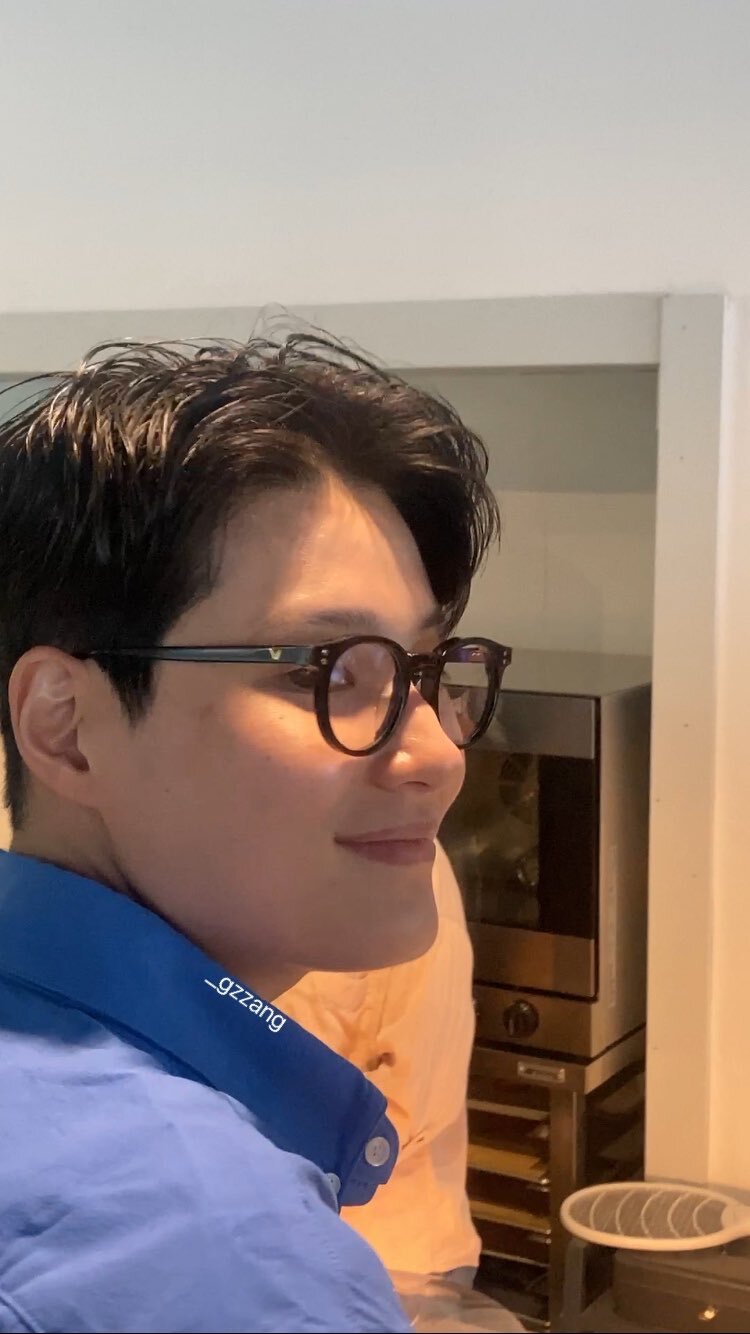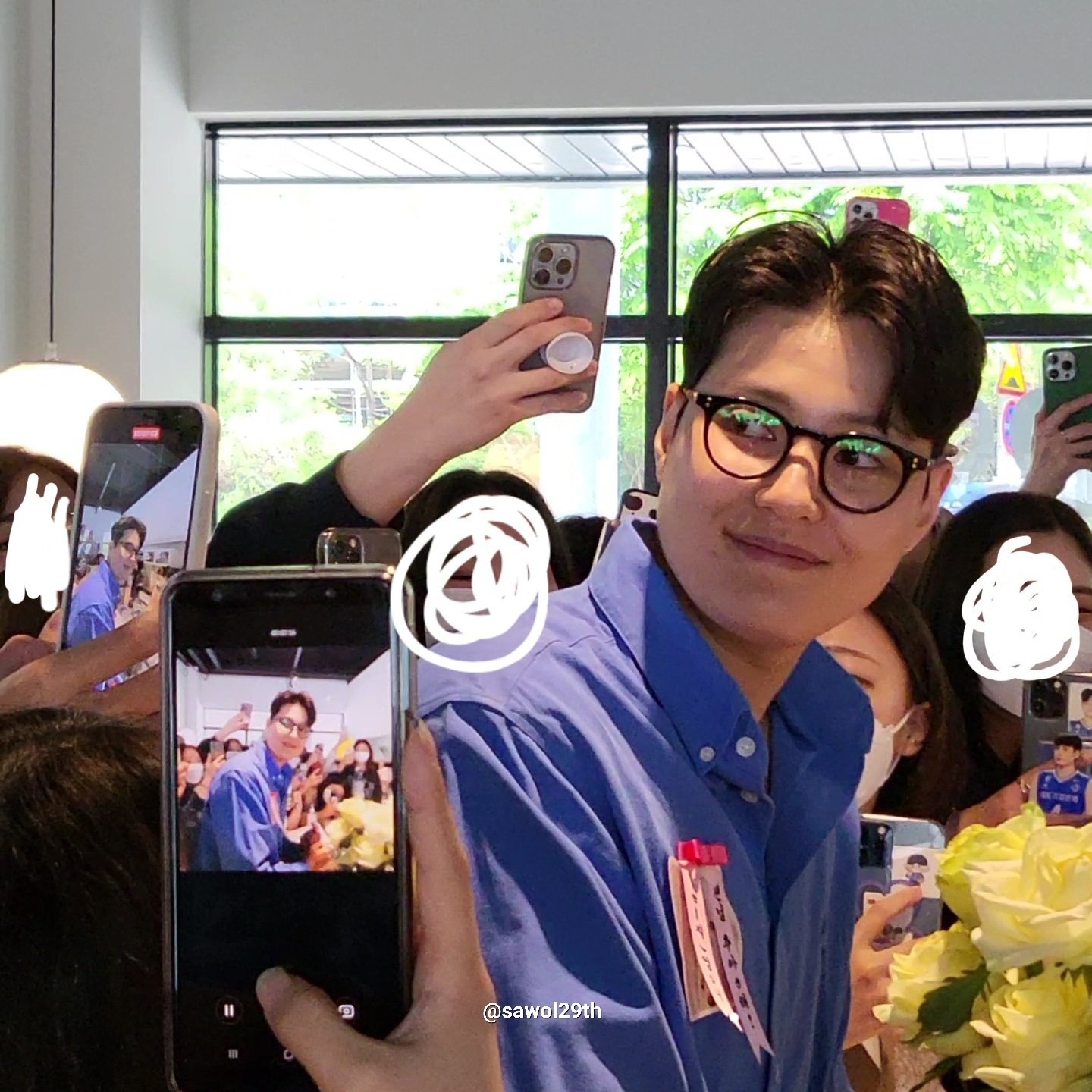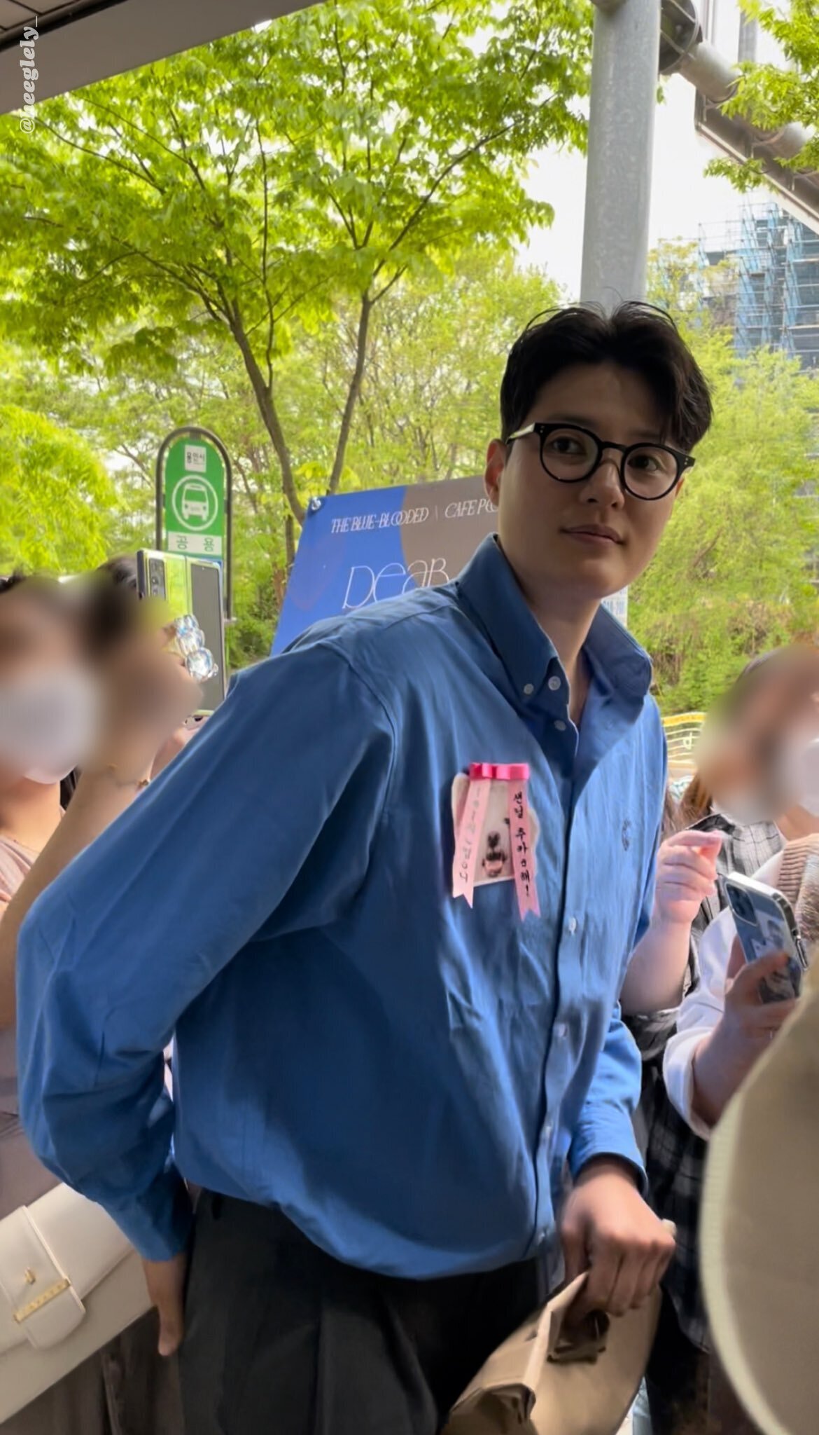 카페 컨셉과 같은 파랑색 셔츠(팬 선물)로 갈아입고
