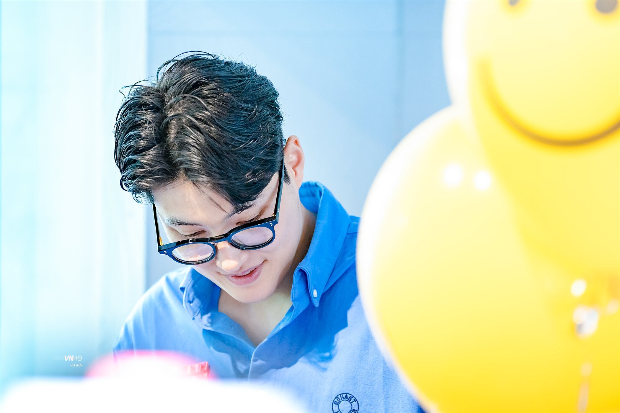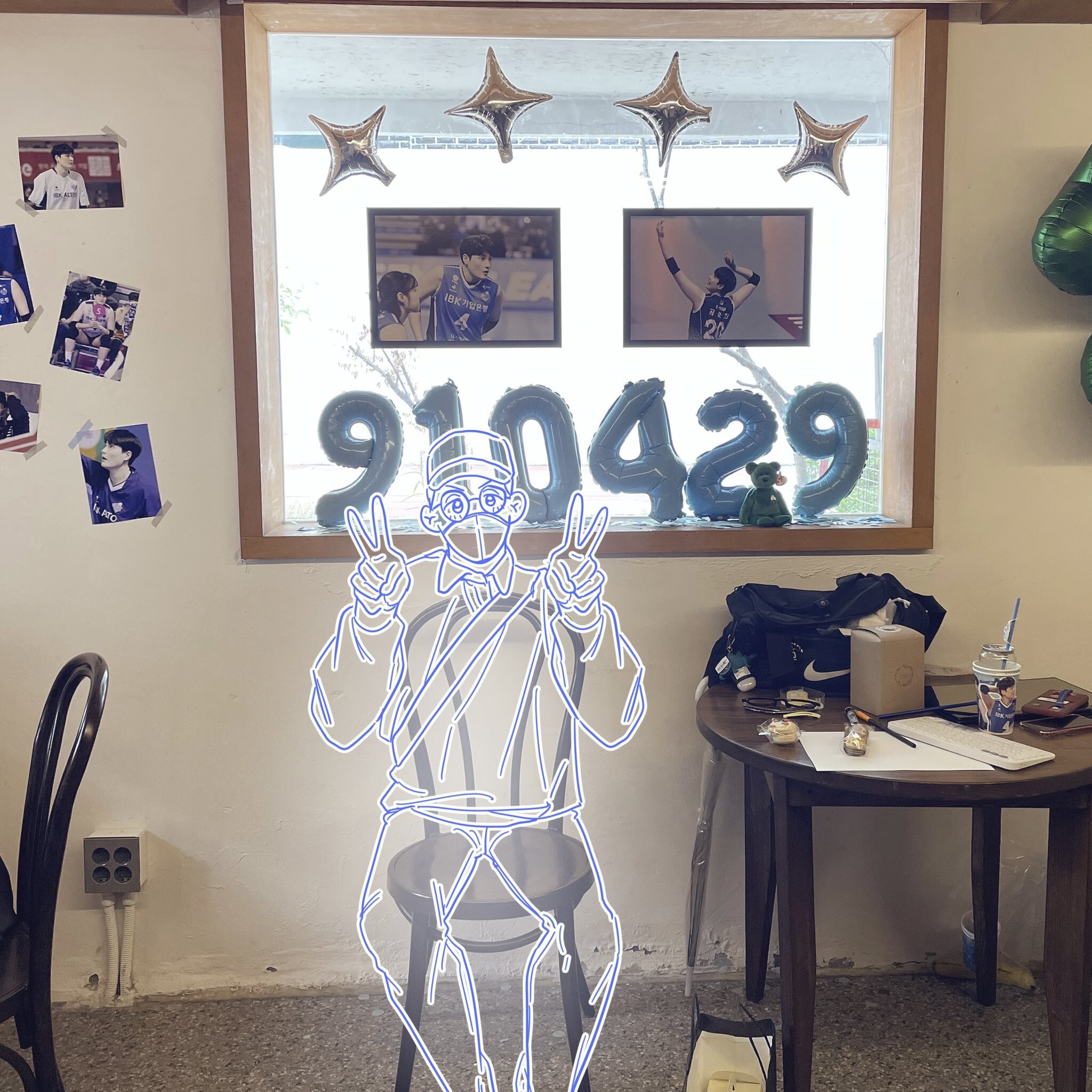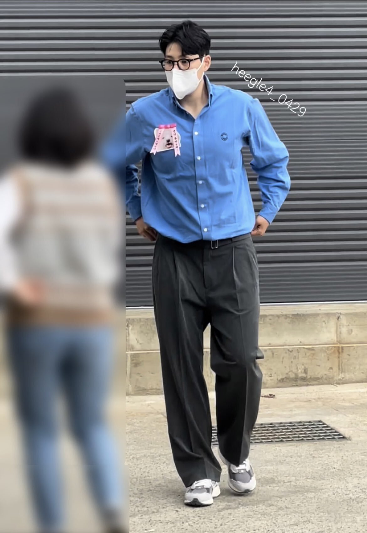 카페 컨셉과 같은 파랑색 셔츠(팬 선물)로 갈아입고