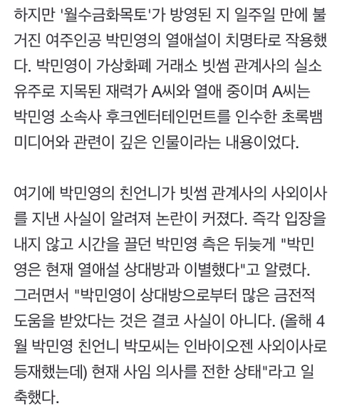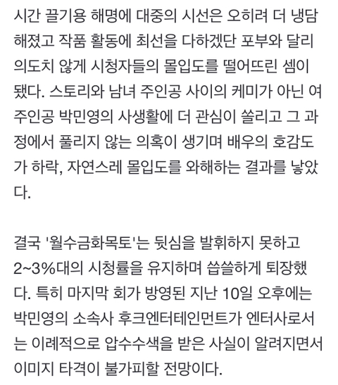작성자미션 작성시간 22.11.19 아... 드라마가 너무재미없어 ㅠㅠ 박민영논란보단 연달아 똑같은 배역,똑같은스타일링,똑같은연기(+드라마내용)이어서 이미지소비도 개심하고 일단드라마 조온나뻔하고재미없음.... 게다가 로코의 꽃은 주인공 케미인데 박민영 고경표 너무 케미가 안살아.... 고경표가 캐릭을 못살린건지 아님 캐릭터자체가 소생불가 무매력 캐릭인지 아님 둘다인지... ㅋㅋ 모르겠지만 조온나 매력없는 캐릭터고 드라마도 노잼이고... 박민영 논란탓만은 아닌거같은게 만약 김비서때 당시에 사건 터졌다면 그래도 드라마 인기있었을거 같음ㅋㅋ 반대로 지금 드라마에 논란 없었어도 똑.같이 인기 없었을거같고..... 이미지 회복이 문제가 아니라 연기변신 안되는 문제를 더 걱정해야될거같어