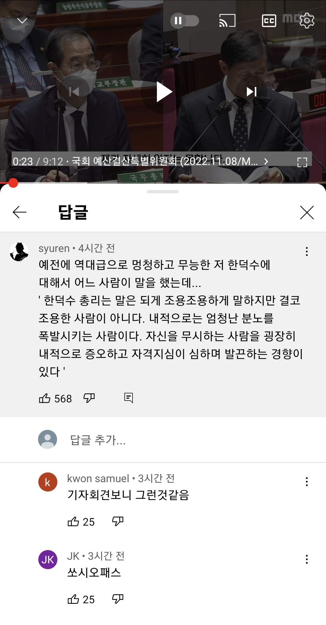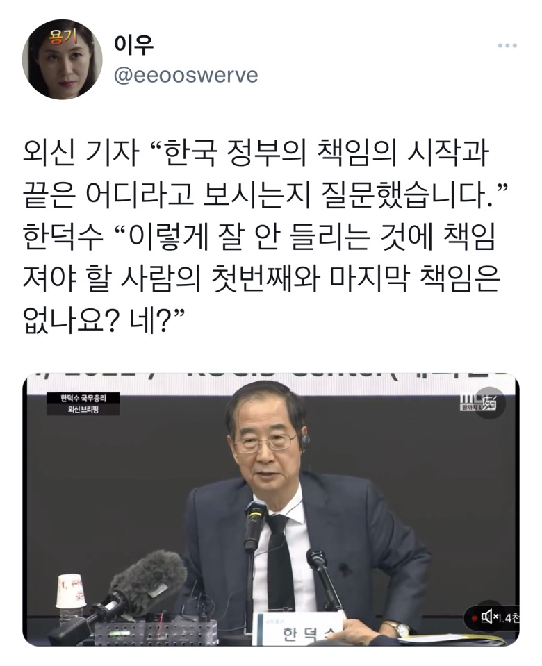 정부의 책임을 묻는 외신기자의 질문에 발끈해서 주제랑 빗나간 헛소리 꺼내고 조롱섞인 말장난한것도