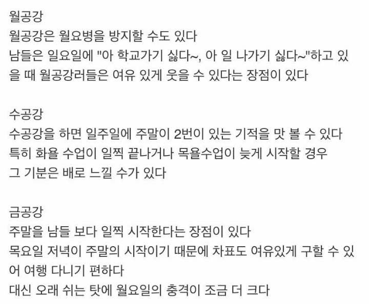 작성자유기농식혜 작성시간 22.11.15 난 월금 공강이었는데ㅋㅋㅋ 그래서 이제 화수금이 거의 9교시 풀인...ㅋㅋㅋㅋ 점심도 못먹고 수업듣고 그랬는데 월금 공강이 너무 좋아서 1학년 때 빼고 내내 월금 공강이었어