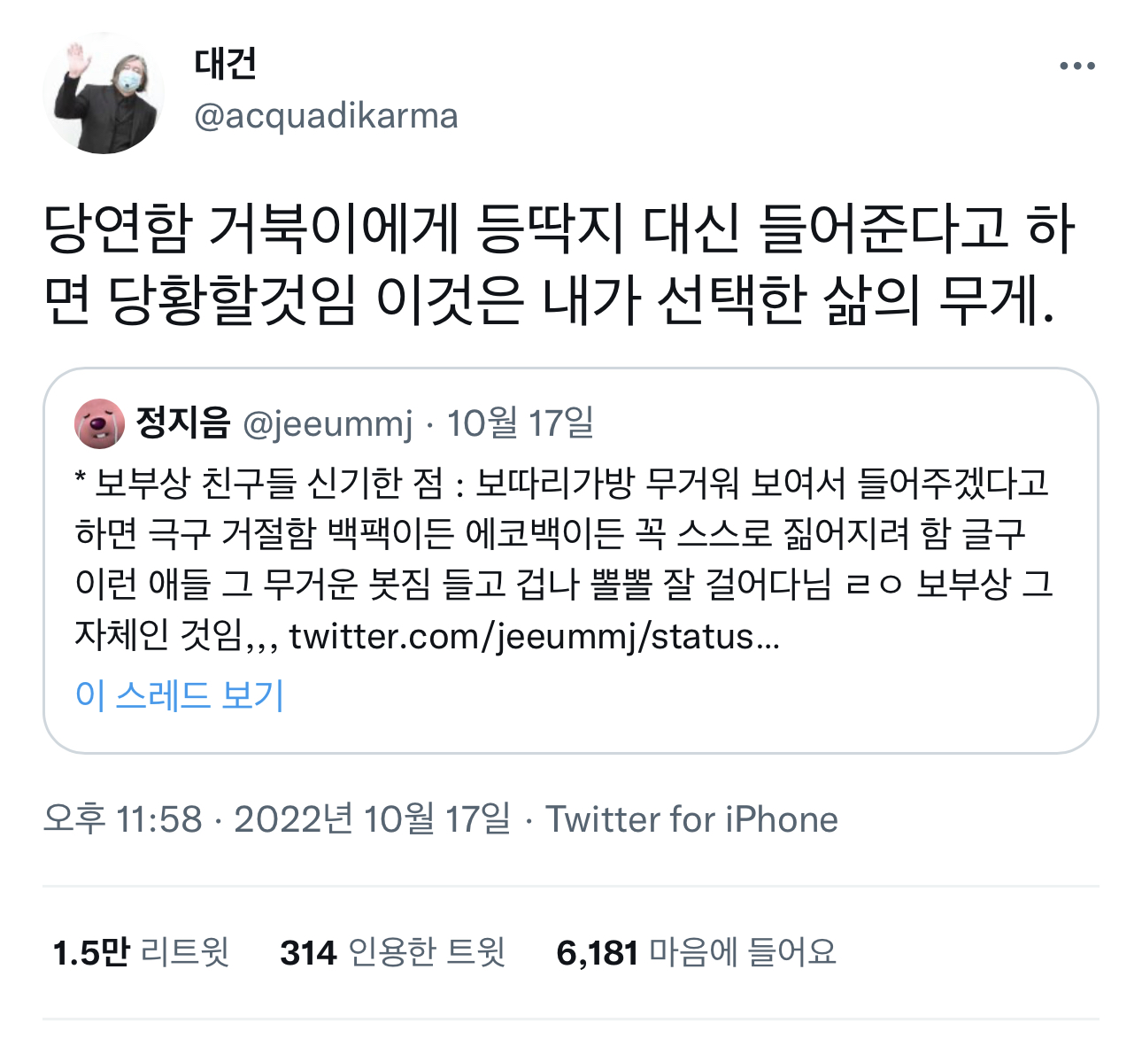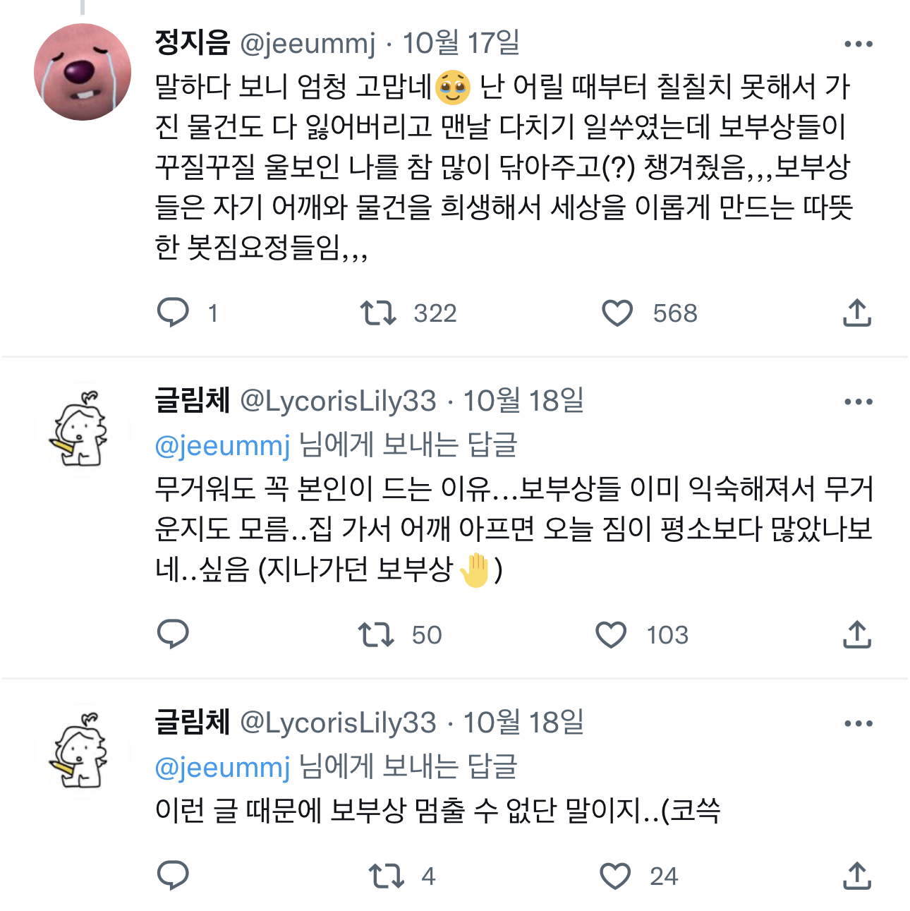 작성자시크녀임 작성시간 22.11.16 보부상 10년하다가 어깨 나가서 잠정적으로 보부상 은퇴중 ㅋㅋㅋ