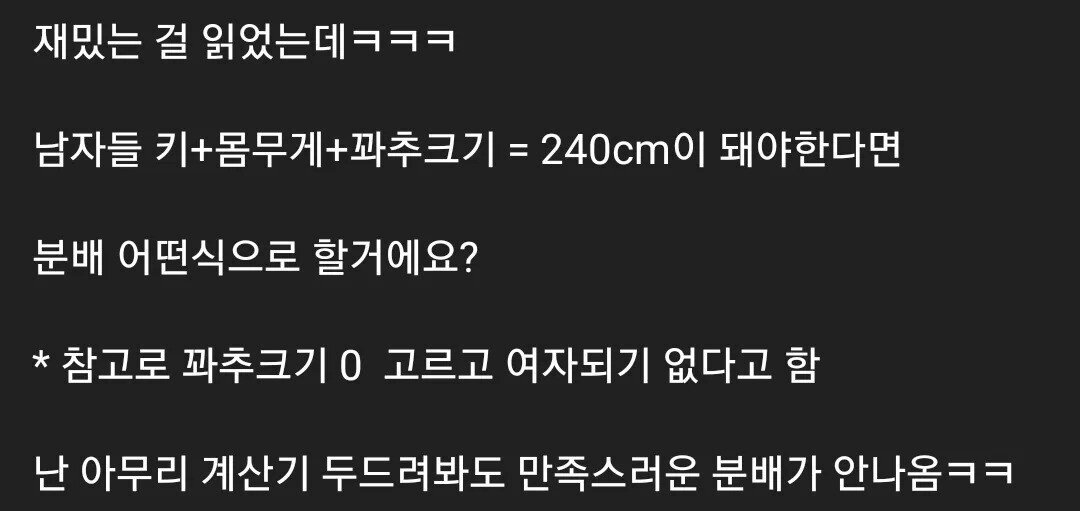 키+몸무게+꽈추=240이 안되면 걍 죽어 사라지는게 낫지 모.. 그렇다고 몸무게 80넘으면 죽어