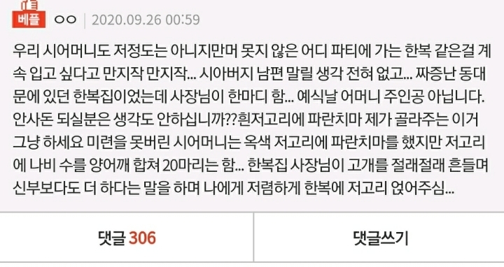 저한테 신이나셔서 보여주시며 너무 예쁘지?? 하더라구요나중에 남친한테 저게 뭐냐고 어떻게 저러시냐 했더니 남친은 아~~~무 생각이 없네요 한복이면 다 되는 거 아니냐면서 모지리 같은게 ...