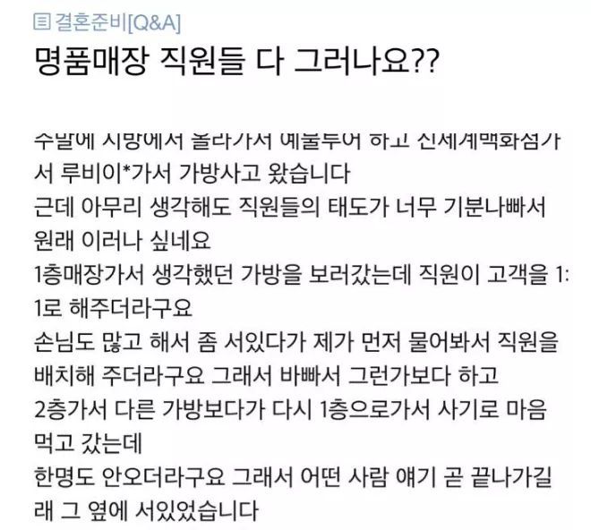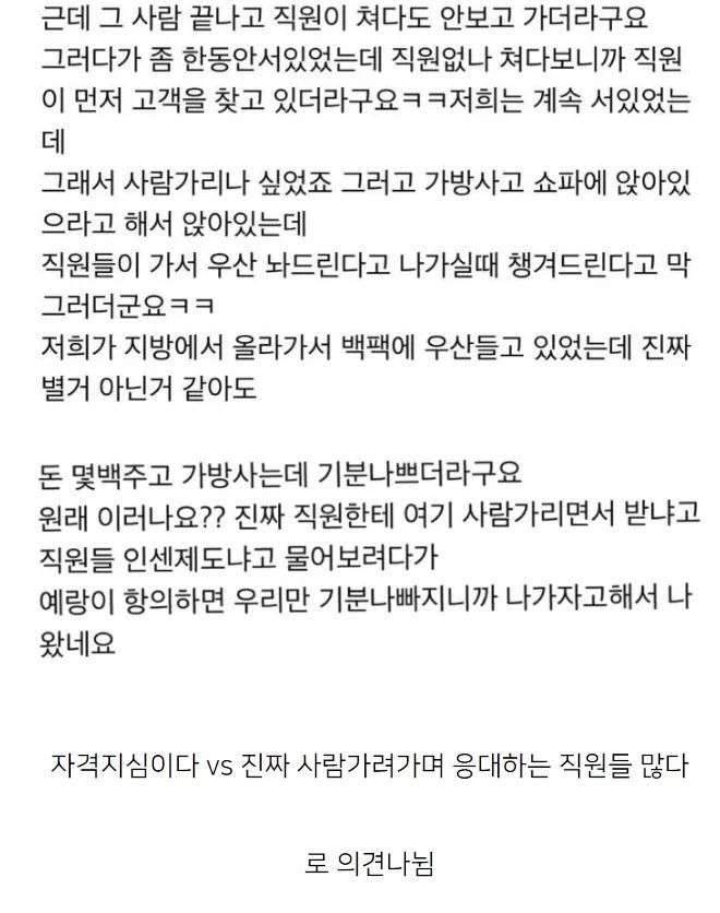 물건을 어떻게 무조건 가서 보고 한큐에 사 보고 안살수도 있는데 그런 손님들 지들끼리 욕하고 그냥 슥보고 살거같은 손님한테만 잘해주고, 차림으로 무시하는게 다른 서비스직에 비해 유독 심하지 물론 친절한 직원도 당연 있겠지만 -