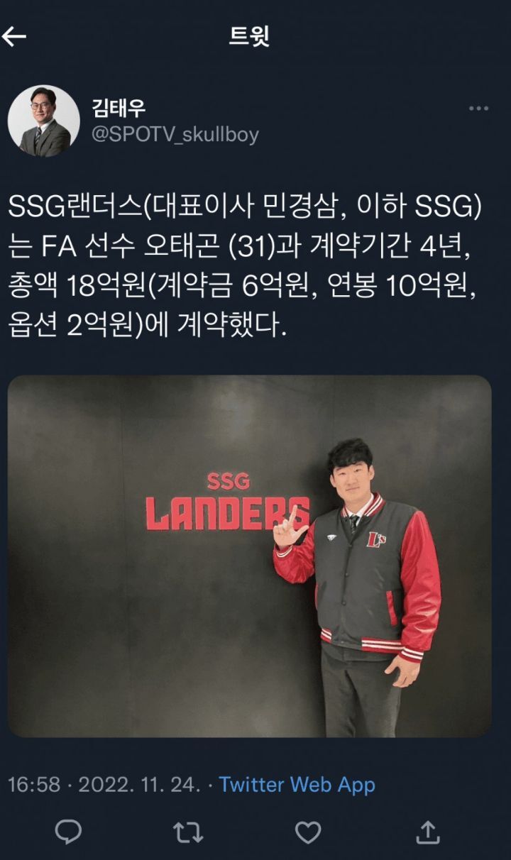 [기타][프로야구] SSG 오태곤 잔류 작성자이승엽|작성시간22.11.24|조회수3,131 목록 댓글 34 글자크기 작게가 글자크기 크게가 출처 : 여성시대 (본인 닉네임)@SPOTV_skullboy 다음검색 현재 게시글 추가 기능 열기 북마크 공유하기 신고 센터로 신고 댓글 댓글 34 댓글쓰기 답글쓰기 댓글 리스트 작성자소클라테스 | 작성시간 22.11.24 마지막에 호수비했다거 그런거니??? 돈이 넘쳐나는구나 작성자딸기티라미슈 | 작성시간 22.11.24 에바야.... 작성자화산채귀환 | 작성시간 22.11.24 아ㅠ 개비싸ㅠ 백업이 뭔 그럴꺼면 우리 영결들이랑 프차들한테 돈을 더주지 만년 백업을 18억이나 주냐 작성자自由香港 | 작성시간 22.11.24 고장난 오태곤 ㅎㅇㅌ~~~헐 근데 좀 비싸네 .. 떼잉 작성자GO LANDERS | 작성시간 22.11.25 내년부터 더 잘해주시오,, 댓글 전체보기