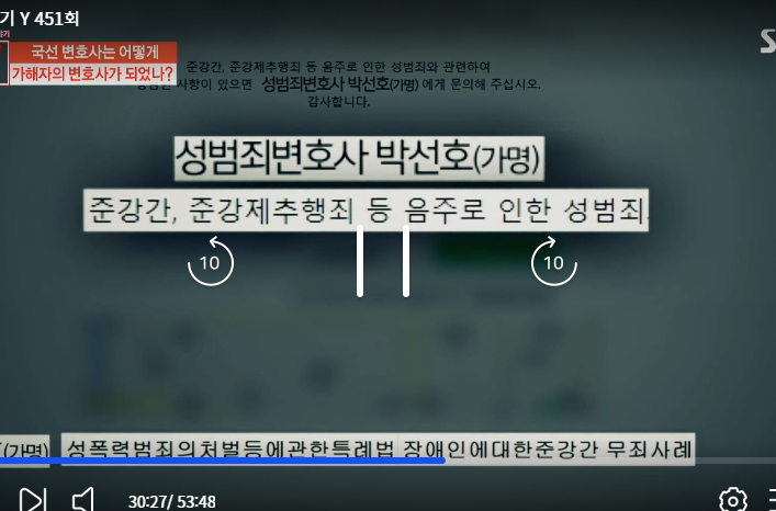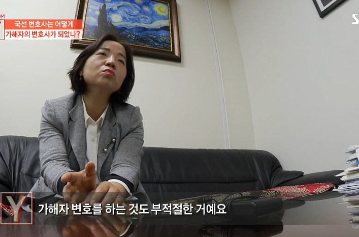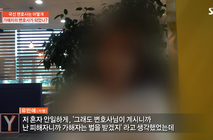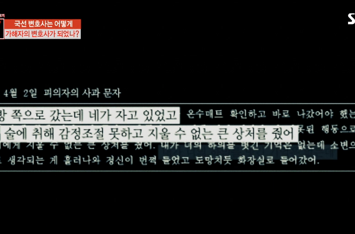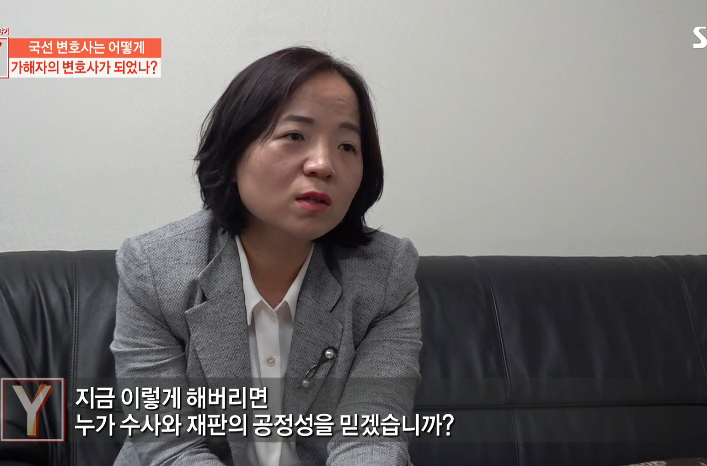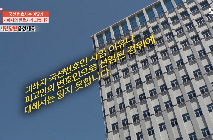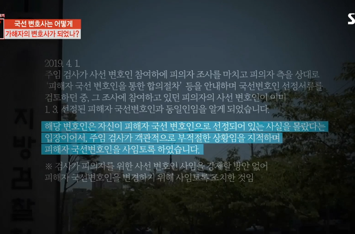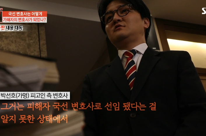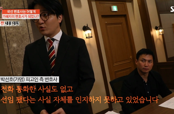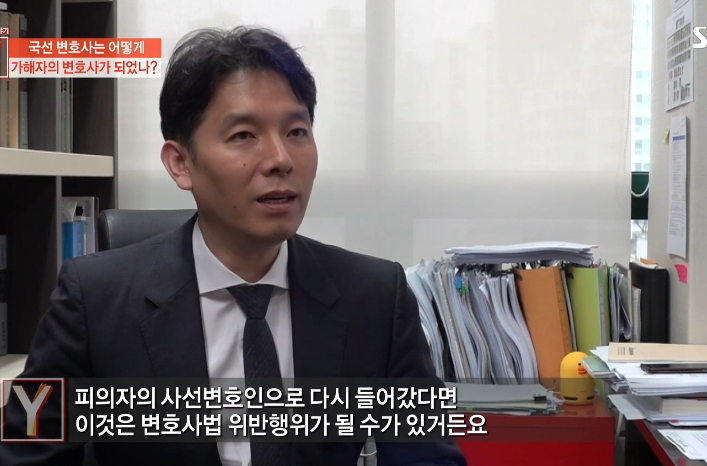 자신은 피해자 변호를 맡은 줄 몰랐고 그 전에 이미 가해자측 변호사가 된 상황이다 말함 피해자와 연락도 하지 않았고 바로 국선변호는 취소했다고 함