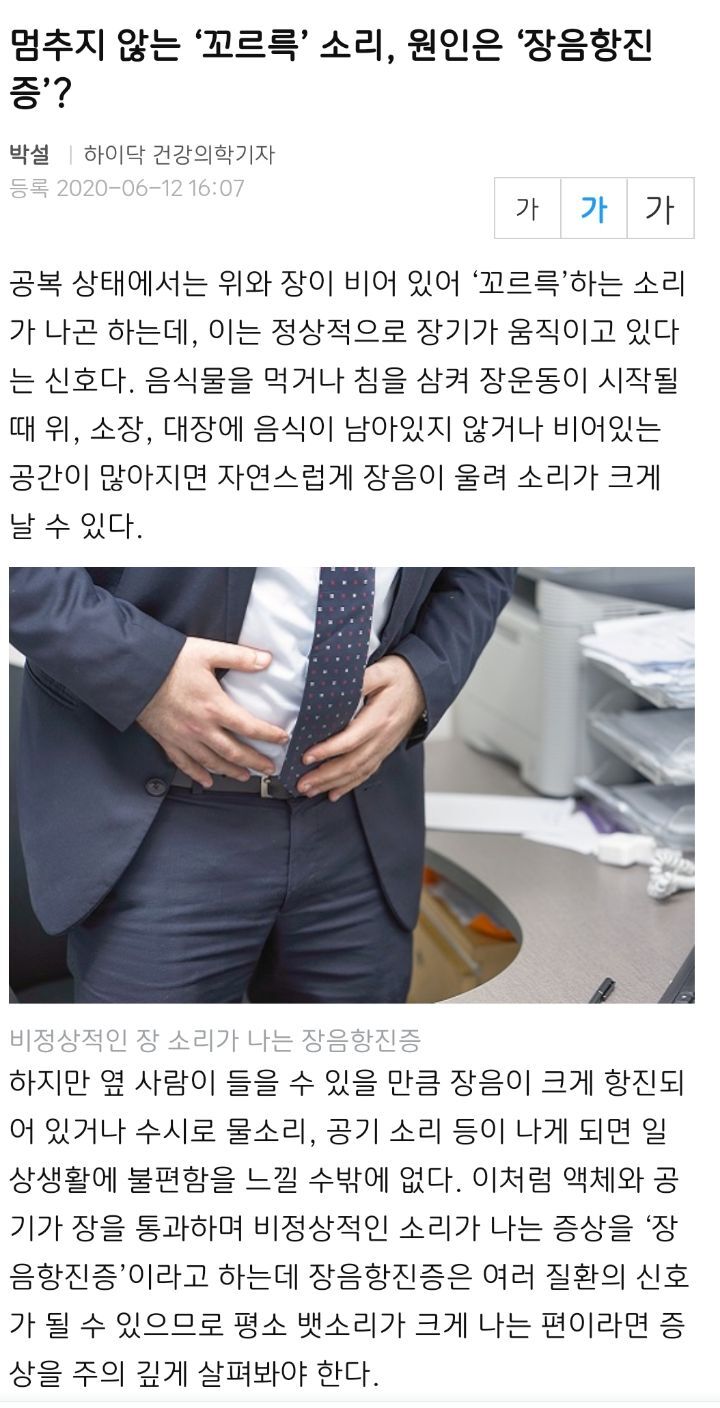 [스크랩] [여시뉴스데스크]멈추지 않는 '꼬르륵' 소리, 원인은 '장음항진증'? 작성자두경|작성시간22.11.27|조회수3,993 목록 댓글 13 글자크기 작게가 글자크기 크게가 출처 : 여성시대 (밀리밀라)https://mobile.hidoc.co.kr/healthstory/news/C0000519729전문 출처로 다음검색 스크랩 원문 : *여성시대* 차분한 20대들의 알흠다운 공간 현재 게시글 추가 기능 열기 북마크 공유하기 신고 센터로 신고 댓글 댓글 13 댓글쓰기 답글쓰기 댓글 리스트 작성자공포의 저주 인형 | 작성시간 22.11.27 아니 심지어 방구 소리처럼 나서 미치겠다니까 작성자난이제백수다라랄라라라랄 | 작성시간 22.11.27 헛…과민성대장인줄 알았는데… 작성자익명 | 작성시간 22.11.27 살아있는거구나.. 내 장기야 작성자수건팔이 | 작성시간 22.11.27 식전에 트리메부틴말레산염 먹으면 좀 ㄱㅊ더라 작성자이렇게좋운데 | 작성시간 22.11.27 곤약젤리 먹고나면 유독심한거같음 댓글 전체보기