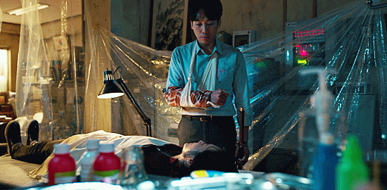 지하주차장에서 괴물과 싸우다 한쪽 팔이 다친 재헌 맹장 때문에 누운 지수