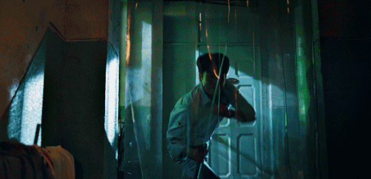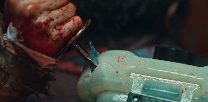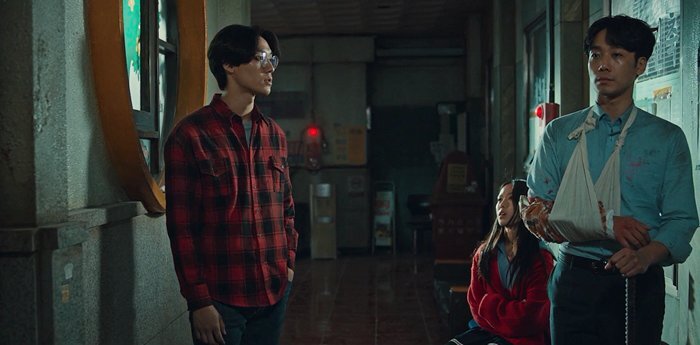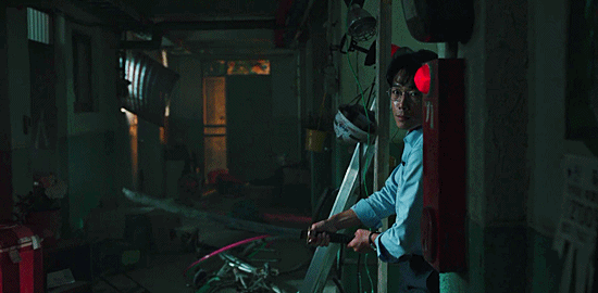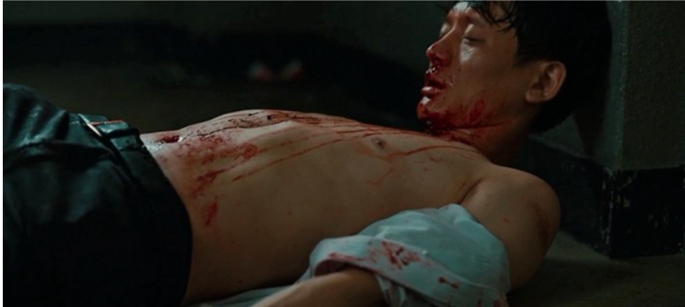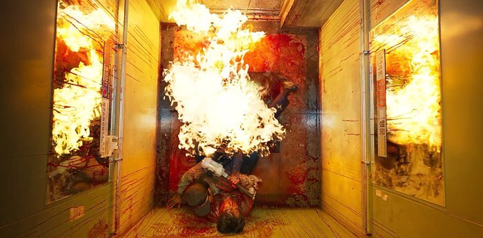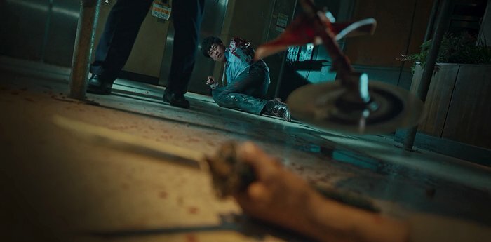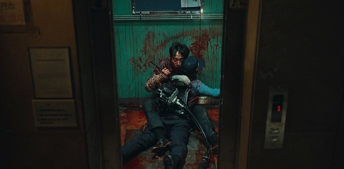 재헌은 남은 한 팔로 경비원을 엘리베이터로 끌고 들어가 예초기의 기름통을 칼로 찍어 빼냄 이때 자리 비웠던 사람들이 급하기 돌아옴