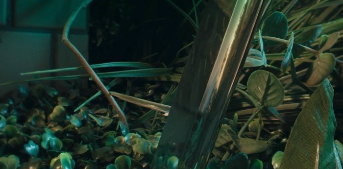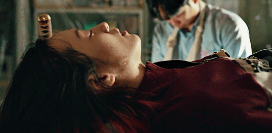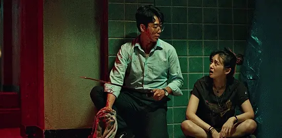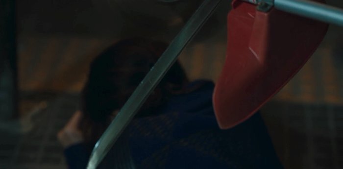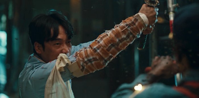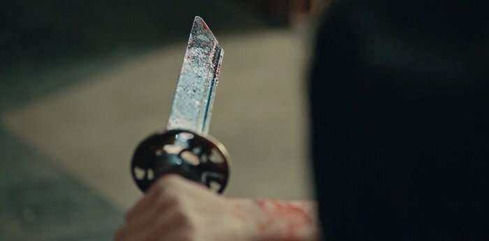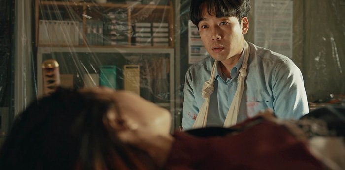 지수는 무서워하면서 계속 말을 하고 재헌은 천으로 칼에 묻은 피를 닦아내면서 티를 안 냄
