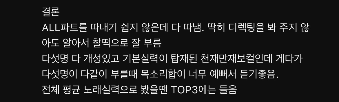 퍼포는 약하지만 레코딩 비하인드도 보면 다들 음악에 진심인 것 같아서 재밌어 덕질하는 팬까진 아닌데 앨범 나오면 꼭 다 들어서 이런거 한상 찾아봄
