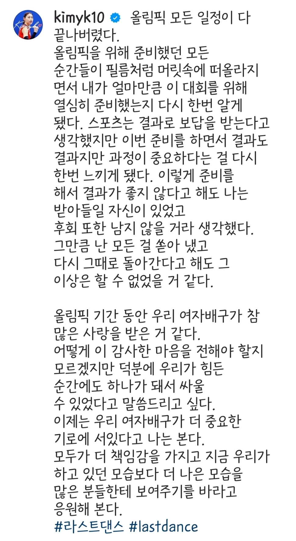 그리고 연경 선수의 마지막 올림픽 소감이 인스타에 올라오는데