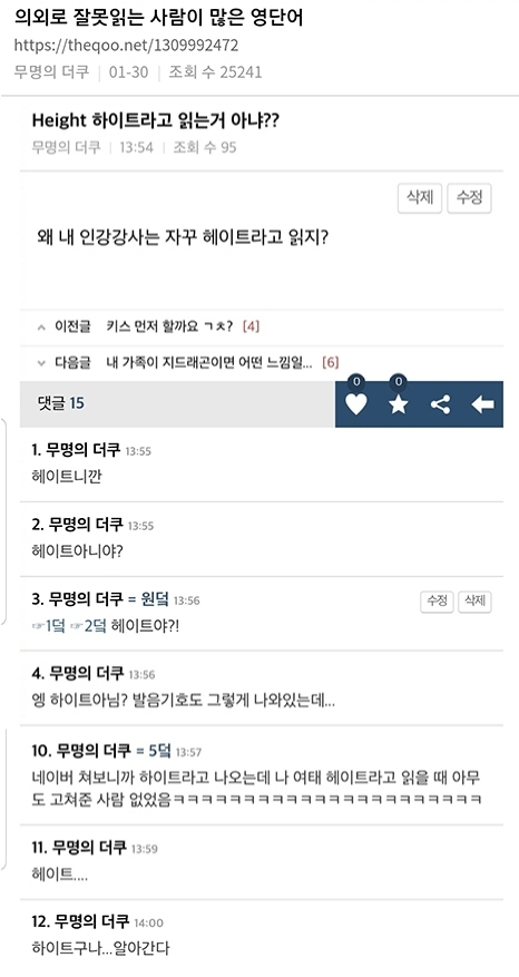 작성자글리도리스 작성시간 22.12.13 영문학과에서 배운 지식을 써먹자면 한글에 비하면 영어는 근본없음. 발음 지좆대로 하는 거 마즘ㅇㅇ