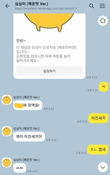 [기타]다시보는 심심이 매운맛 작성자트트치치|작성시간22.12.13|조회수11,925 목록 댓글 6 글자크기 작게가 글자크기 크게가 출처 : 여성시대 트트치치 첫번째는 실화인가.......ㄷ.. 다음검색 현재 게시글 추가 기능 열기 북마크 공유하기 신고 센터로 신고 댓글 댓글 6 댓글쓰기 답글쓰기 댓글 리스트 작성자종현(90.04.08) | 작성시간 22.12.13 악 알바 개웃곀ㅋㅋㅋㅋㅋ 작성자죠나단 죠스타 | 작성시간 22.12.13 너무 거친가...? 하다가 여기서 속절없이 터짐 이미지 확대 답댓글 작성자지저궈주시겠어요? | 작성시간 22.12.13 근데이건ㅋㅋㅋㅋㅋㅋㅋㅋㅋ합성같애 글씨가 다르네.. 작성자손형 | 작성시간 22.12.13 존나쎄네 ㅋㅋㅋㅋ 작성자우리나라지키장 | 작성시간 22.12.13 ㅋㅋㅋㅋㅋㅋㅋㅋㅋㅋㅋㅋㅋㅋㅋㅋ 댓글 전체보기