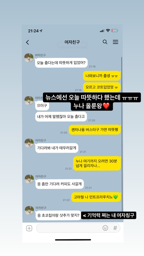 카톡내용보면 추운거 걱정해주고 차로 데리러와준다는 여자가 아랫사람같아보여? 나는 "사랑받는 나"에 뿌듯함을 느끼고 자기를 사랑해주는 여친에게 심히 고마워하고 사랑받는나❤️ 를 인스타 스토리에 전시하는 남자가 훨씬 하타치같아보임.