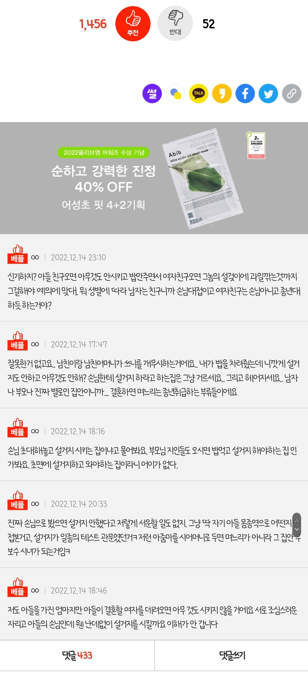 작성자아버지는섹시드라이버 작성시간 22.12.16 손님인데 뭔 설거지요ㅋㅋㅋㅋㅋㅋㅋㅋㅋㅋㅋㅋ??? 며느리한테도 시키는 거 얼척없지만 더더욱 남인데 지 아들이 데려오기만 하면 그냥 즈그집 시녀로 보이는 거임
