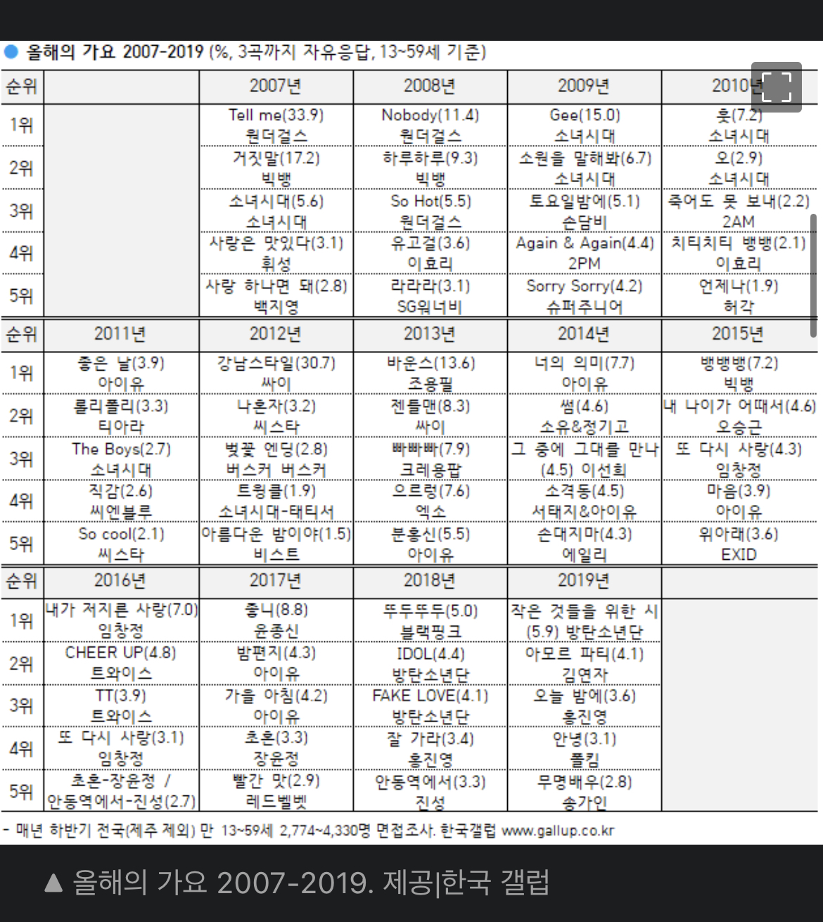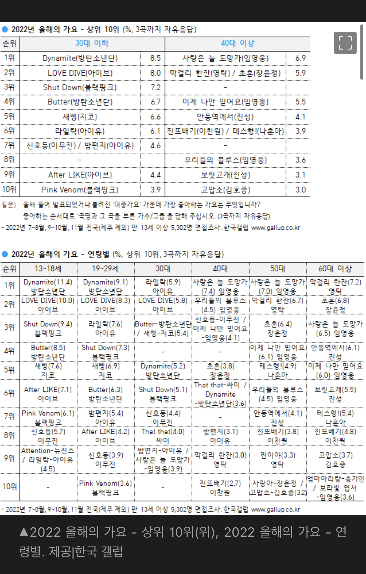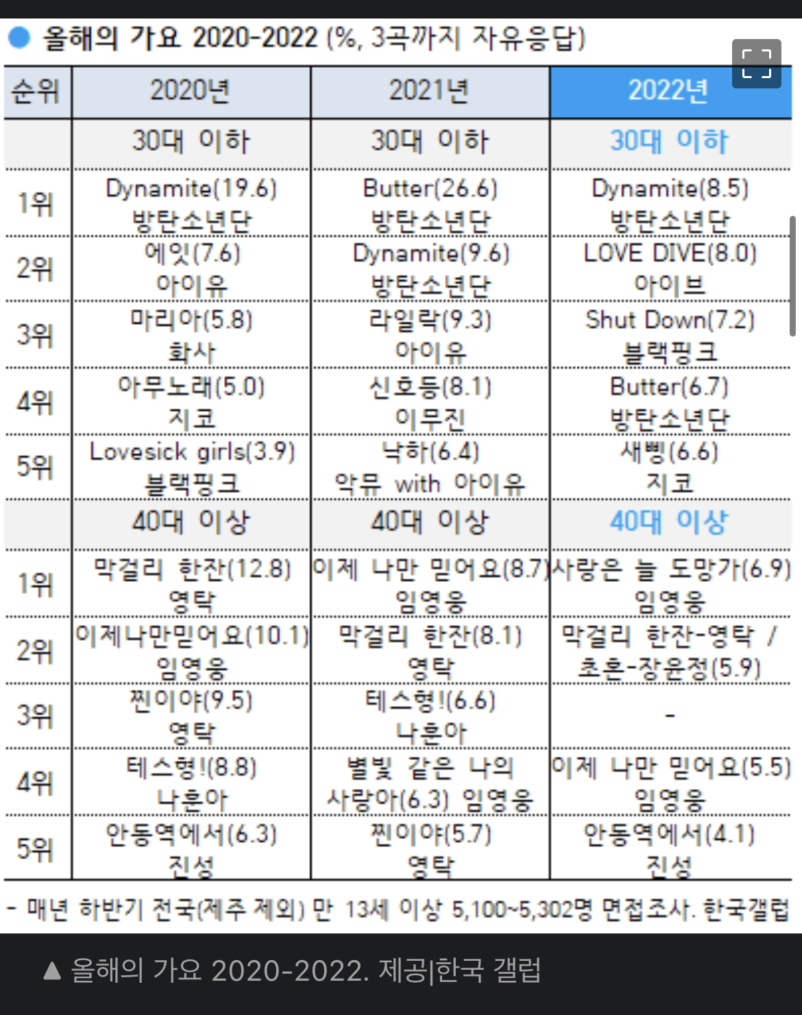 [스크랩] [흥미돋]한국 갤럽 선정 '2022년 올해의 가요' 30대 40대 차이가 극명히 나는게 신기한 달글