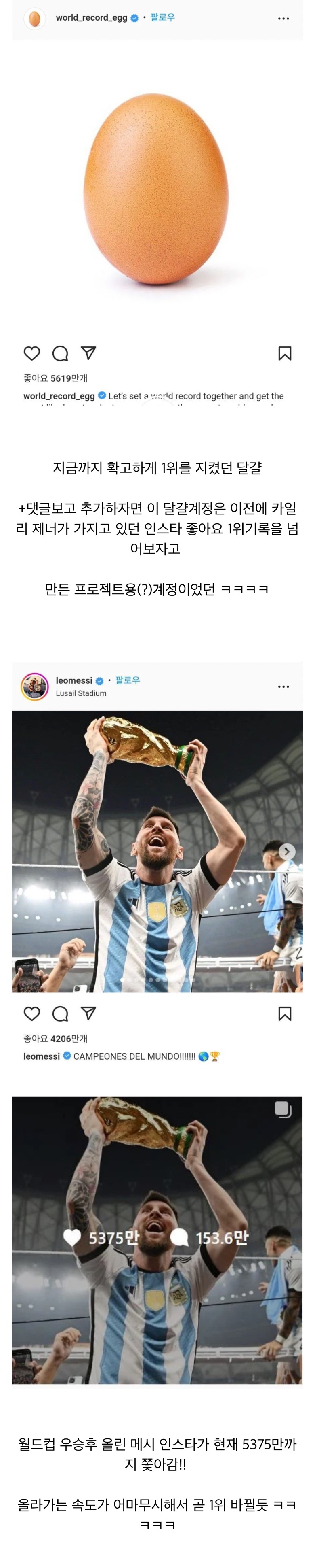 [흥미돋]곧 1위 바뀔것 같다는 역대 인스타그램 좋아요 순위 (feat.메시 vs 달걀) 작성자Air Pod|작성시간22.12.20|조회수17,276 목록 댓글 11 글자크기 작게가 글자크기 크게가 출처 : 여성시대 Air Podhttps://theqoo.net/2670875360 다음검색 현재 게시글 추가 기능 열기 북마크 공유하기 신고 센터로 신고 댓글 댓글 11 댓글쓰기 답글쓰기 댓글 리스트 작성자여전히_아늑해 | 작성시간 22.12.20 눌러주고옴ㅋㅋㅋ 작성자수요일 | 작성시간 22.12.20 눌렀닼ㅋㅋ 지금 5400만됐넼ㅋㅋㅋㅋㅋ 작성자작은 | 작성시간 22.12.20 현재 5522만 ㅋㅋㅋㅋ 작성자쀌이다쀌 | 작성시간 22.12.20 지금누르고왛는데 1위바뀐듯!! 작성자붕어는 팥이지 | 작성시간 22.12.20 넘었다ㅋㅋㅋㅋㅋ 댓글 전체보기