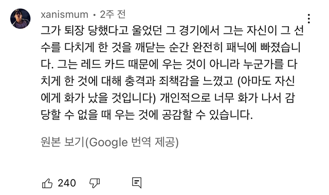 자기가 울잖아 (과거에 손흥민이 플레이하던중 충돌 사고로 상대방 발목이 돌아가서 죄책감에 패닉에 빠졌던적이 있는데 그거 말하는듯)