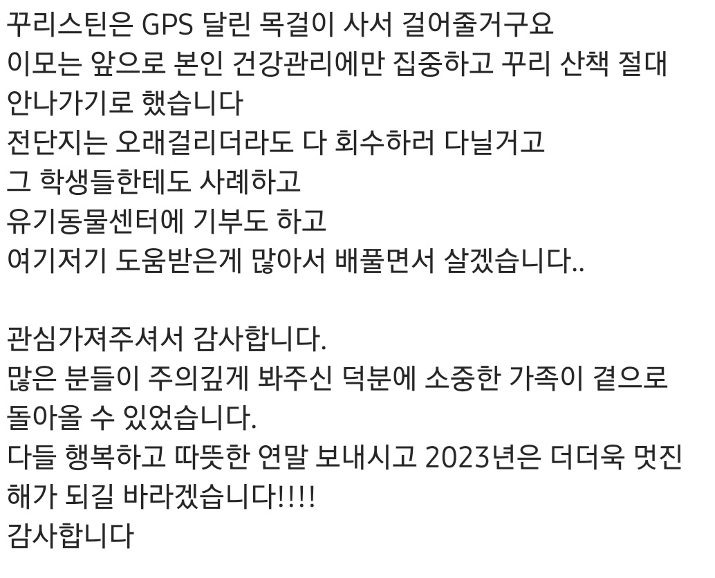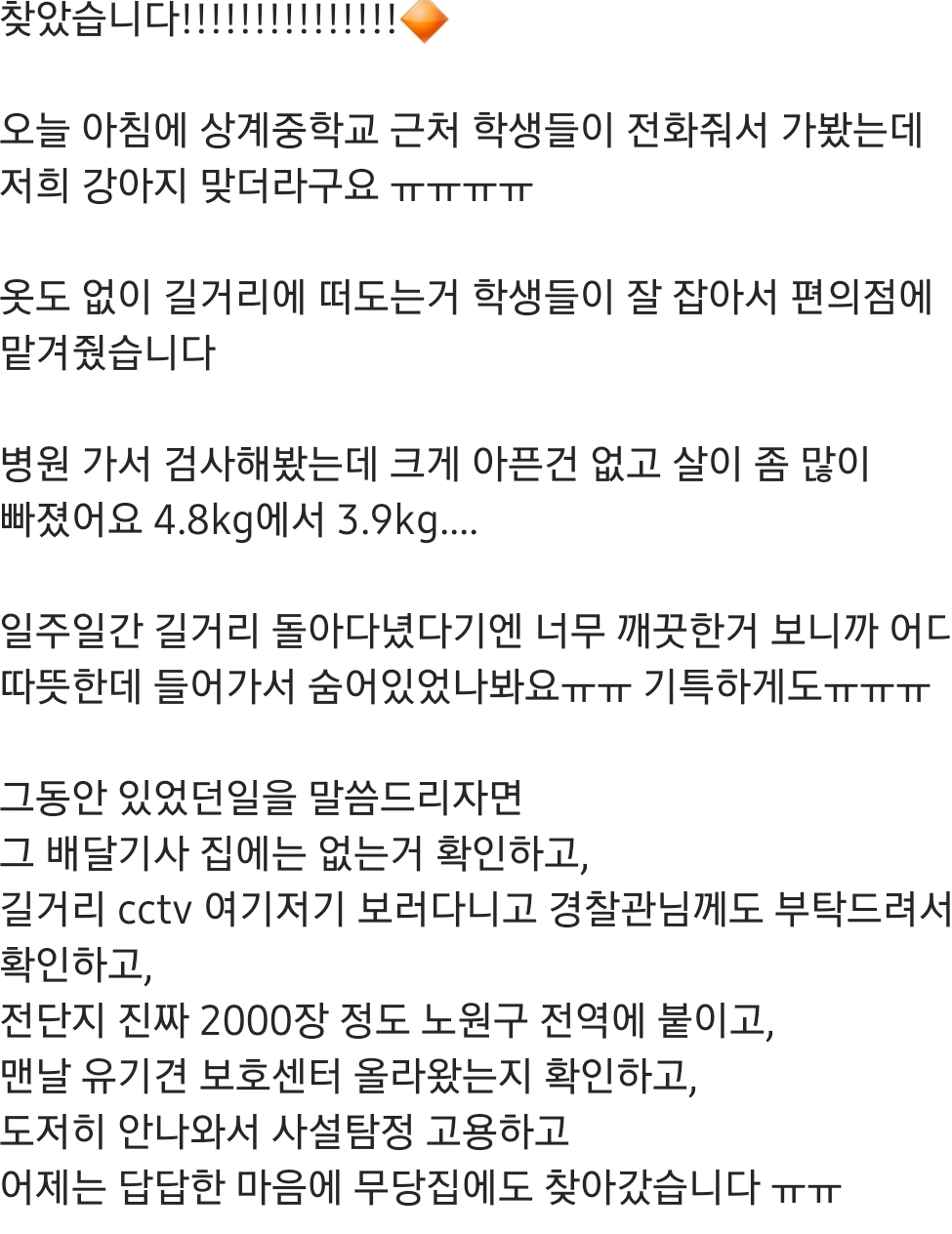 작성자고앵사랑해!! 작성시간 22.12.27 꾸리야 ㅠㅠㅠ 쪼끄만게 얼마나 고생했으면 1키로나 빠졌대 ㅠㅠㅠㅠ 가족들 품으로 돌아가서 너무 다행이다 어떤학생들인지 너무너무 착하다 ㅠㅠ 학생들 좋은일한거 꼭 좋은일로 돌아올꺼야 내가 다 고마워