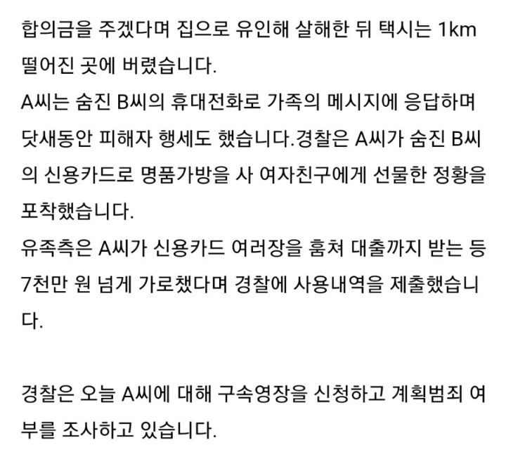 > 음주운전 걸릴까봐 택시기사B한테 보상금주겠다며 본인집으로 유인후 살해. 본인 옷장에 숨김