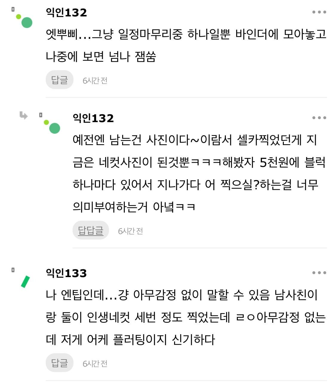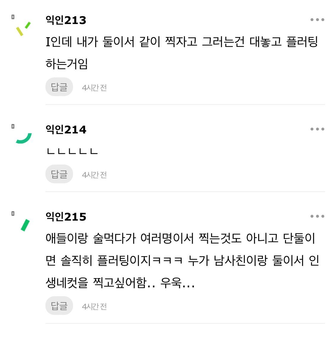 작성자행복한 뚱땡이 작성시간 23.01.03 E인데 인생네컷 500장 정도 있고요.. 그중 남자랑 단둘이 찍은 것도 개많을 것... 약속을 나간다 = 인생네컷을 찍어야 한다임