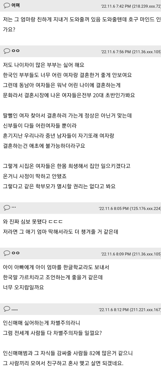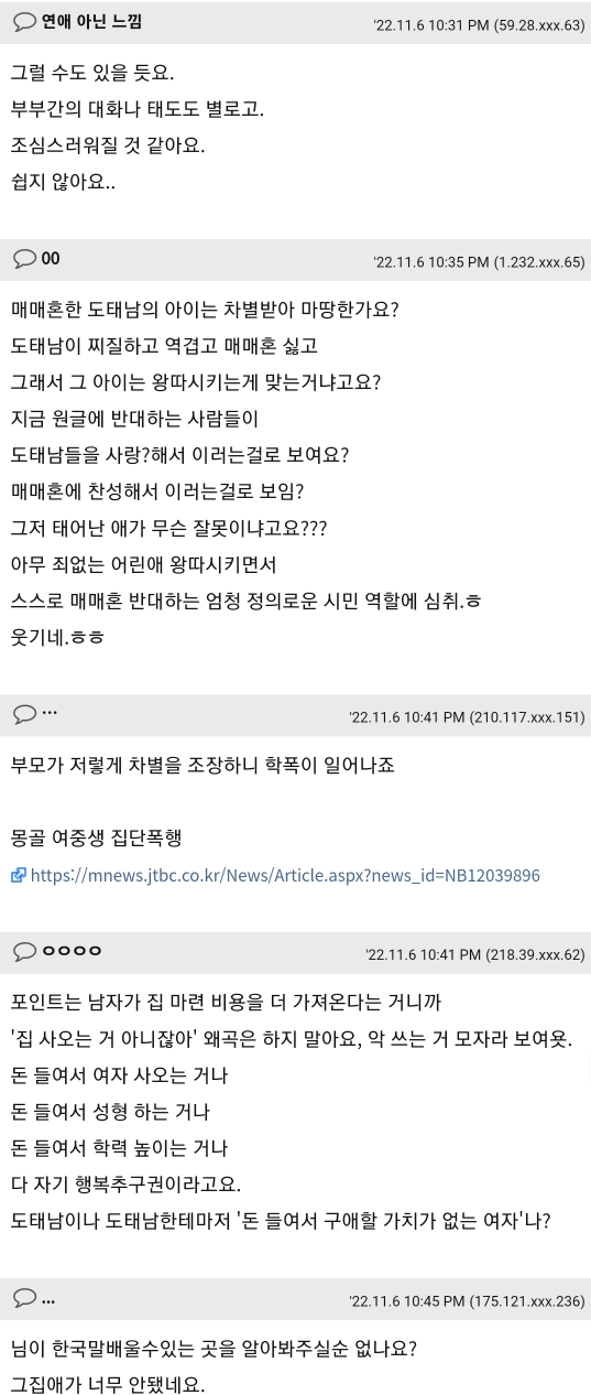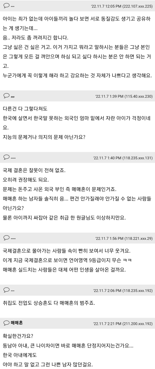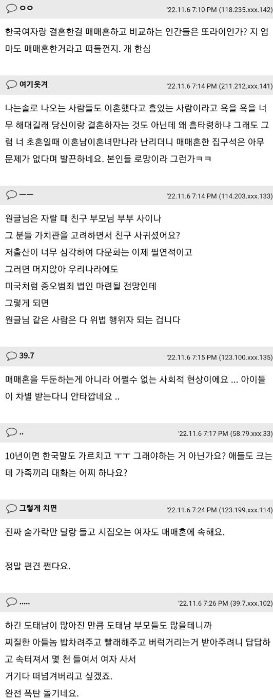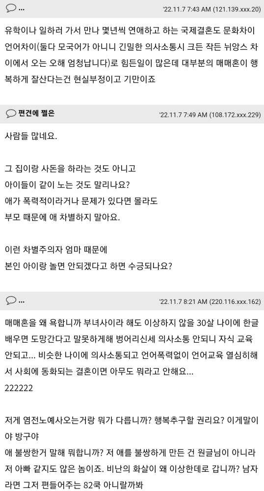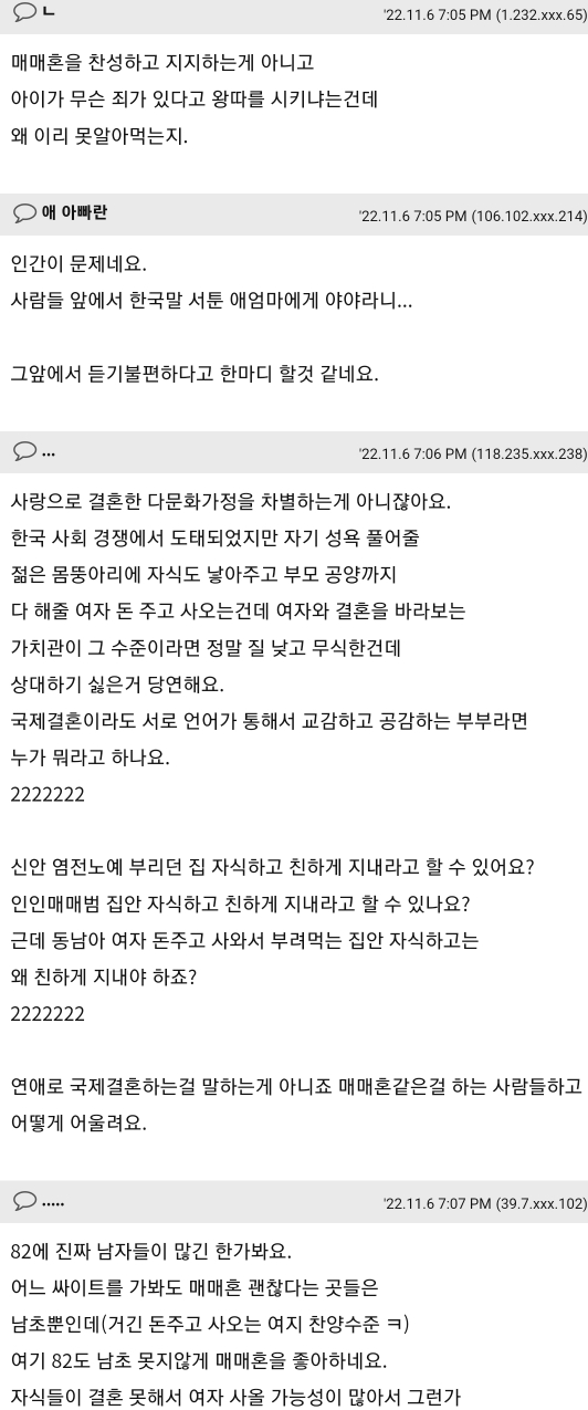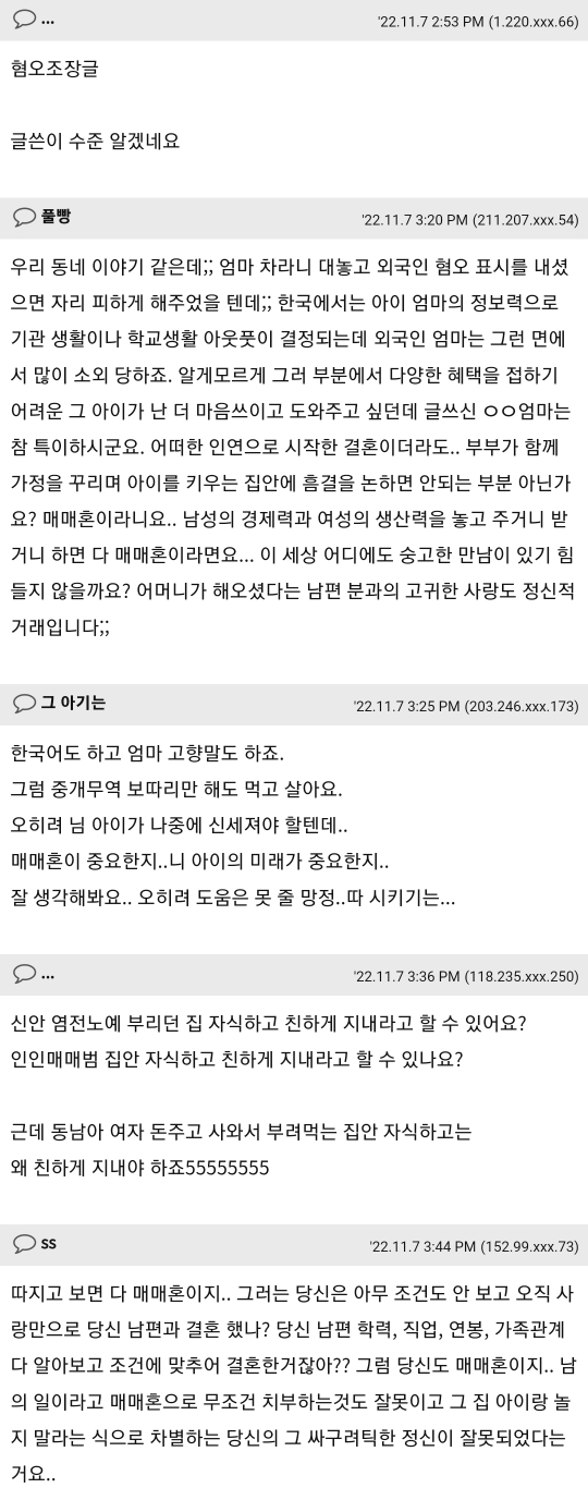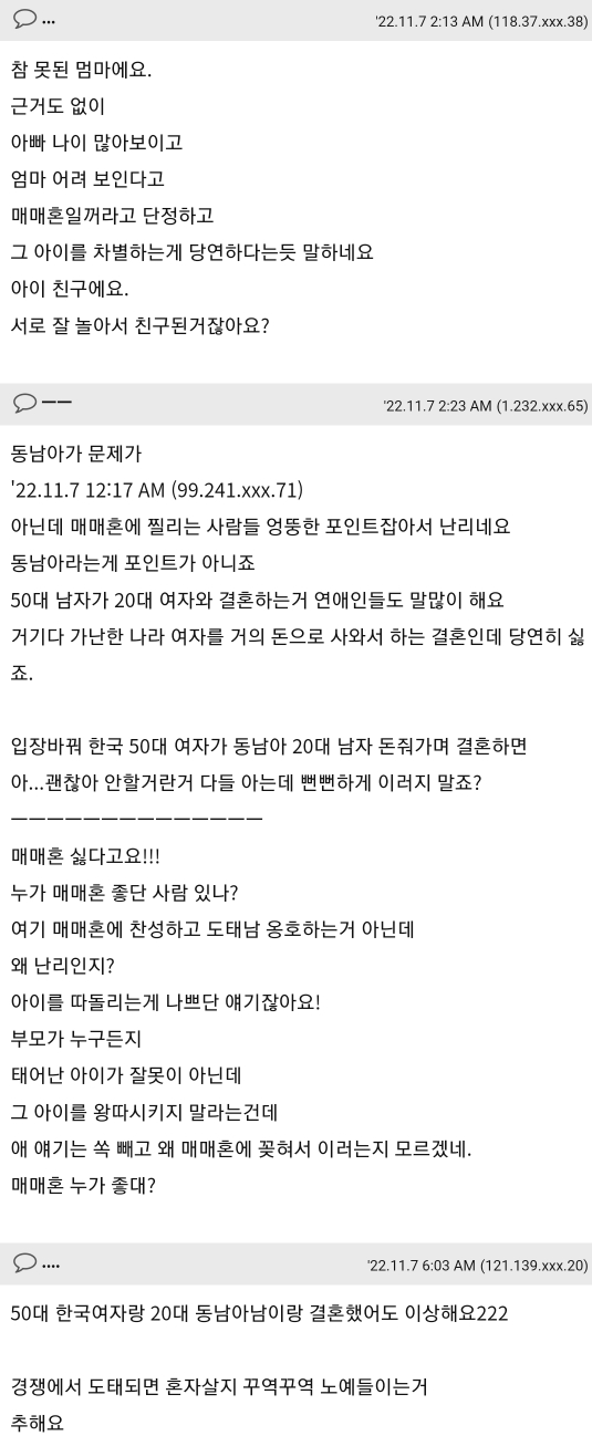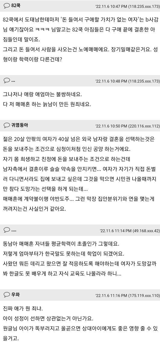작성자설탕안먹어 작성시간 23.01.06 진짜 맥락파악 못한다... 다문화가정이라서 싫은게 아니잖아; '매매'혼이 싫다고......