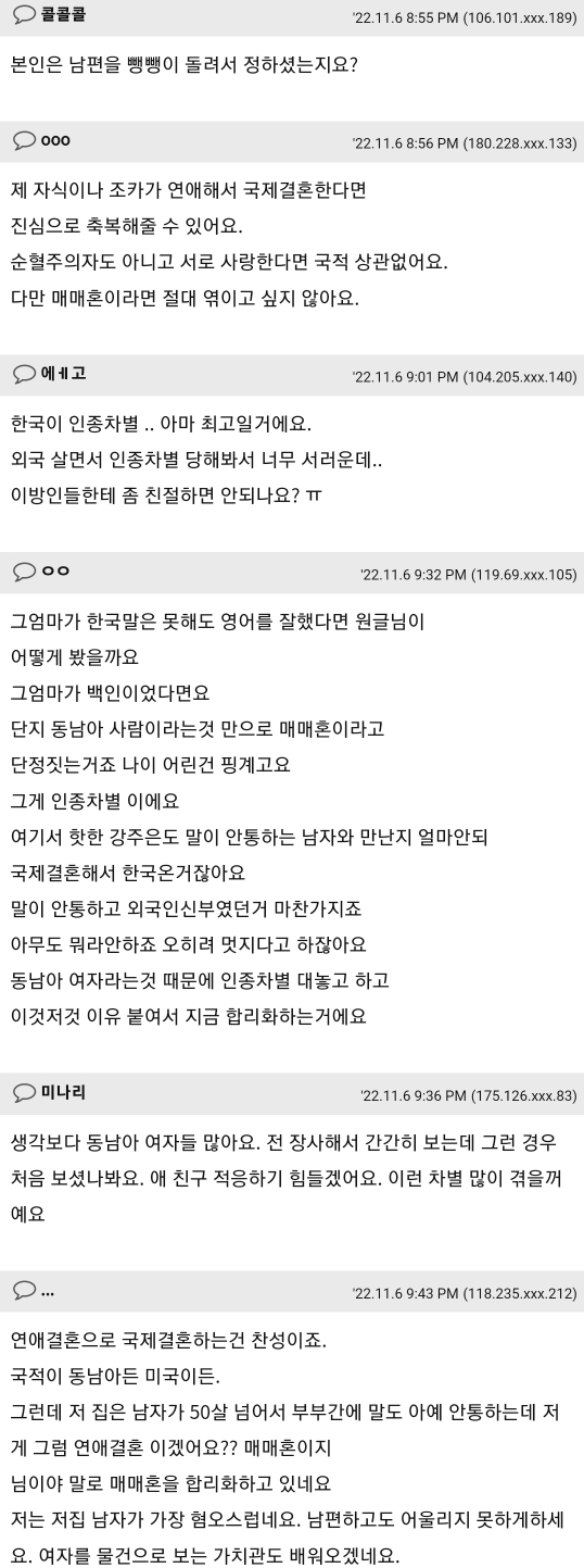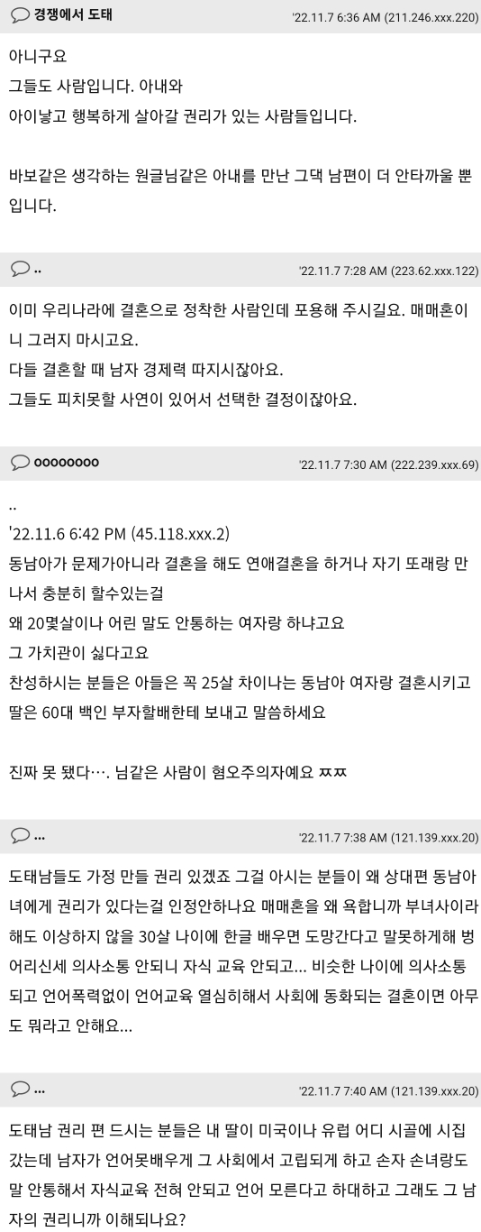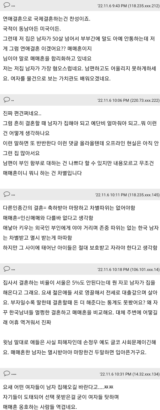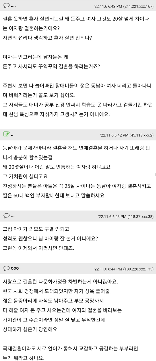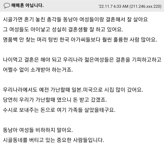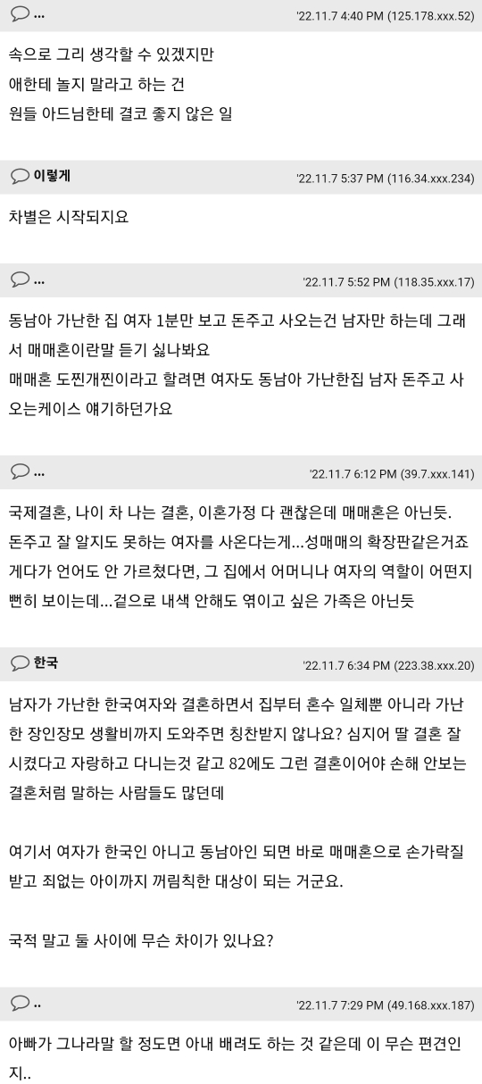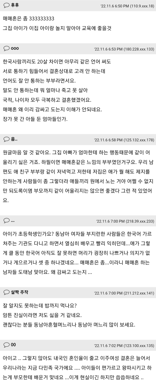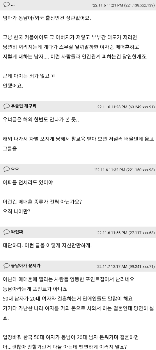 작성자설탕안먹어 작성시간 23.01.06 진짜 맥락파악 못한다... 다문화가정이라서 싫은게 아니잖아; '매매'혼이 싫다고......