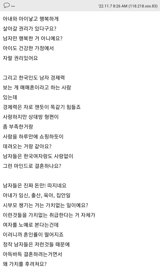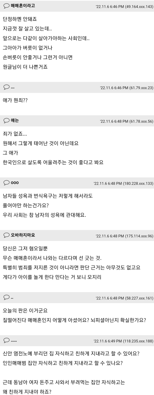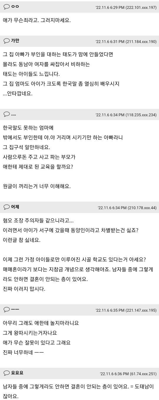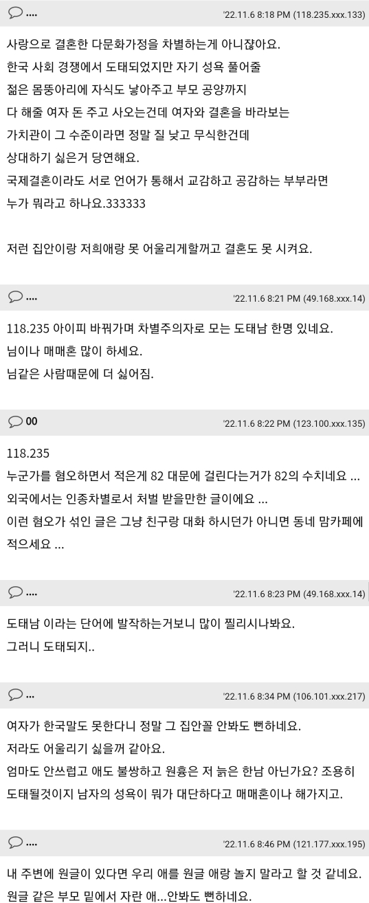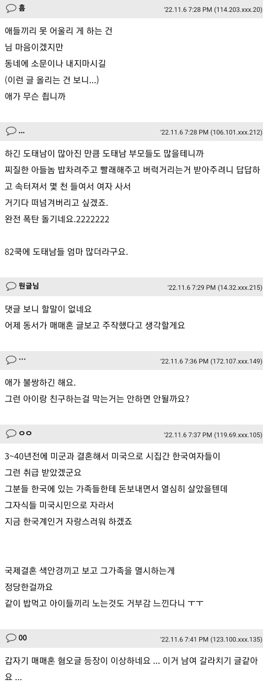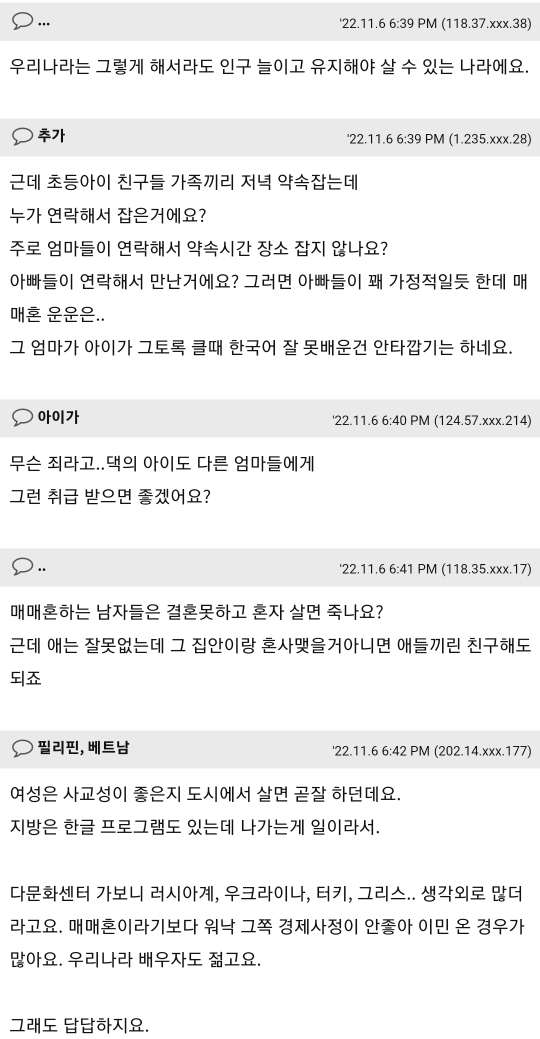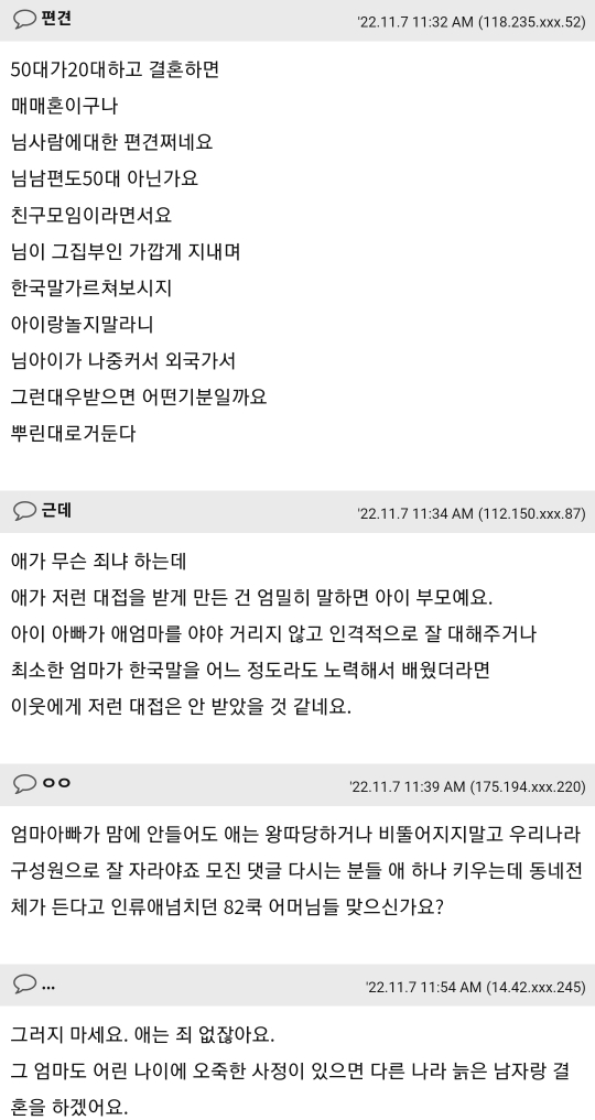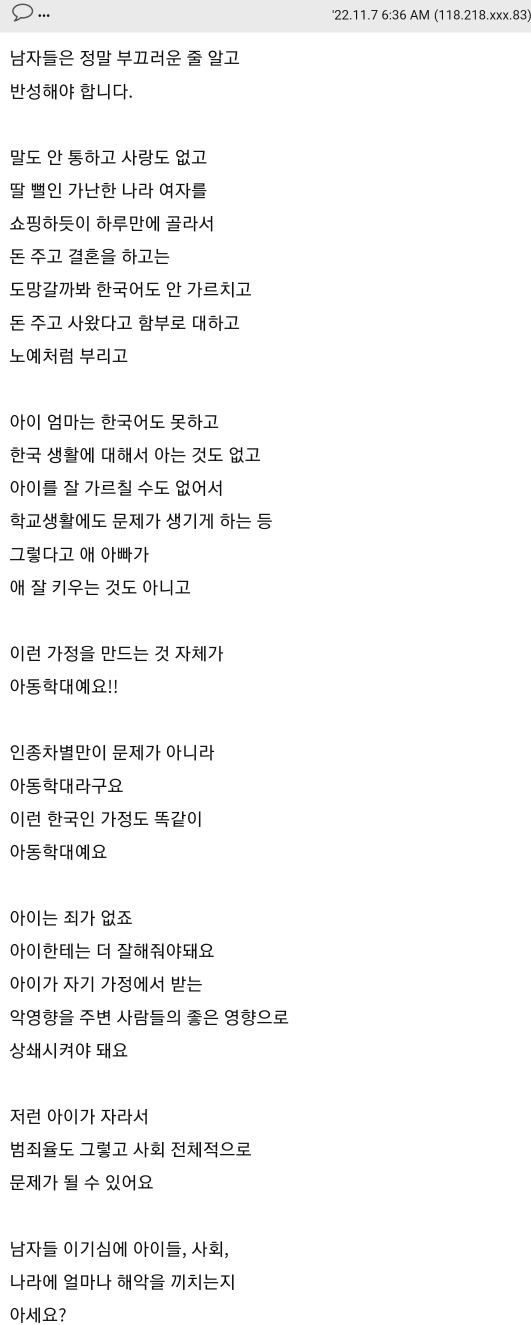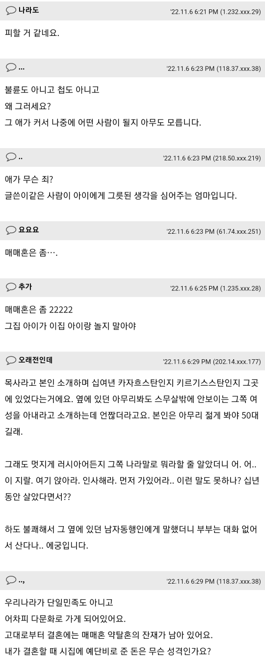 작성자설탕안먹어 작성시간 23.01.06 진짜 맥락파악 못한다... 다문화가정이라서 싫은게 아니잖아; '매매'혼이 싫다고......