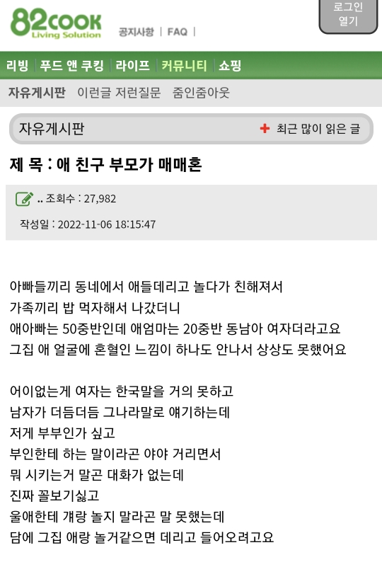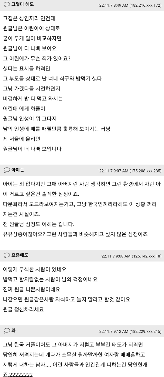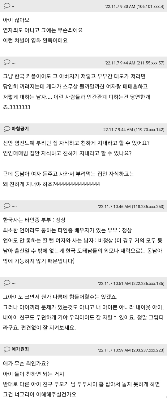 작성자김 진 환 작성시간 23.01.06 애는 잘못이 없지만 계속 친하게 지내면 부모 입장은 걱정될듯. 그 애도 그 집 부모를 보고 사고, 언행을 배울껀데.. 다문화는 이슬람같은거 아닌이상 상관없는데 매매혼, 남편이 아내 대하는 태도 그런게 문제지