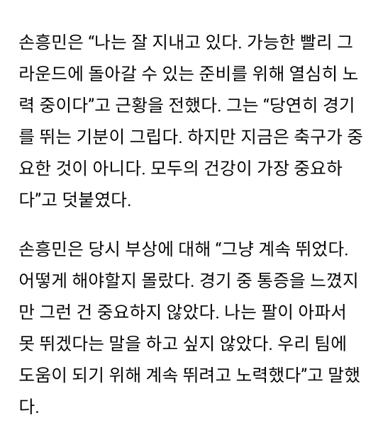 아픈팔 부여잡고 다시 뛰기 시작한 흥민이