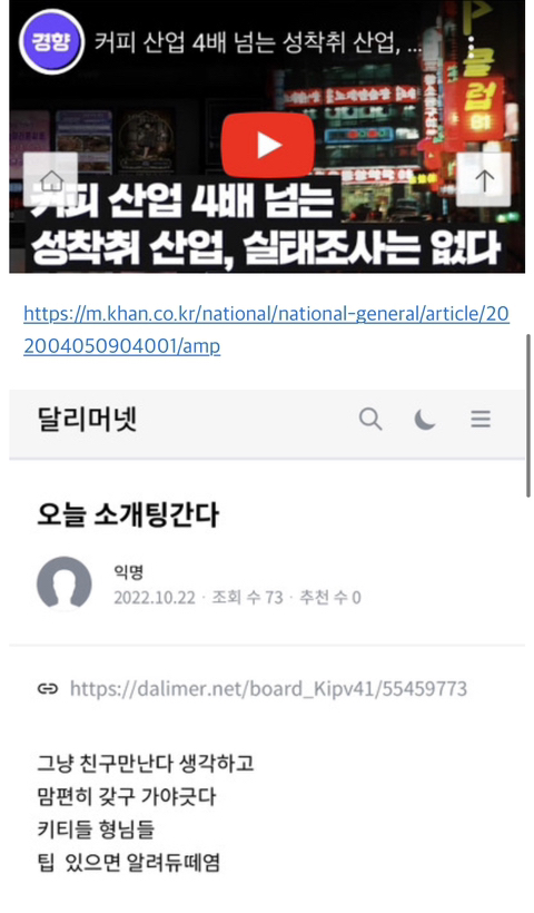 답댓글 작성자훈녀 작성시간 23.01.07 본문 맨마지막 소개팅 보고 생각난건데(저건 진짜 소개팅이겠지만) 성매수남 지가 정기적으로 만남 갖는 성매매 여성 양도?분양? 뭐더라 단어가 정확히 생각이 안나는데 암튼 저런 단어 써가면서 다른 성매수남한테 소개도 하고 별 짓거리 다함ㅋㅋ..