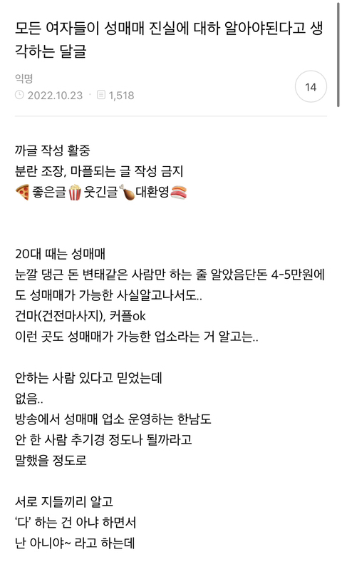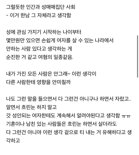작성자훈녀 작성시간 23.01.07 친한 남사친 3명이 그러던데 남자들 다 간다곸ㅋㅋㅋㅋ 심지어 이 말 들었을때 나 대학생이었어 오히려 여자들이 남자들 다 성매매하는건 아니라고함...ㅎㅎ 외모/학력/재산과 상관없더라 잘생기고 인기 많아도 성매매하고 공부 할만큼 한 놈도 성매매함 여친있는 사랑꾼도 술마시고 안마방가던데 뭐,,