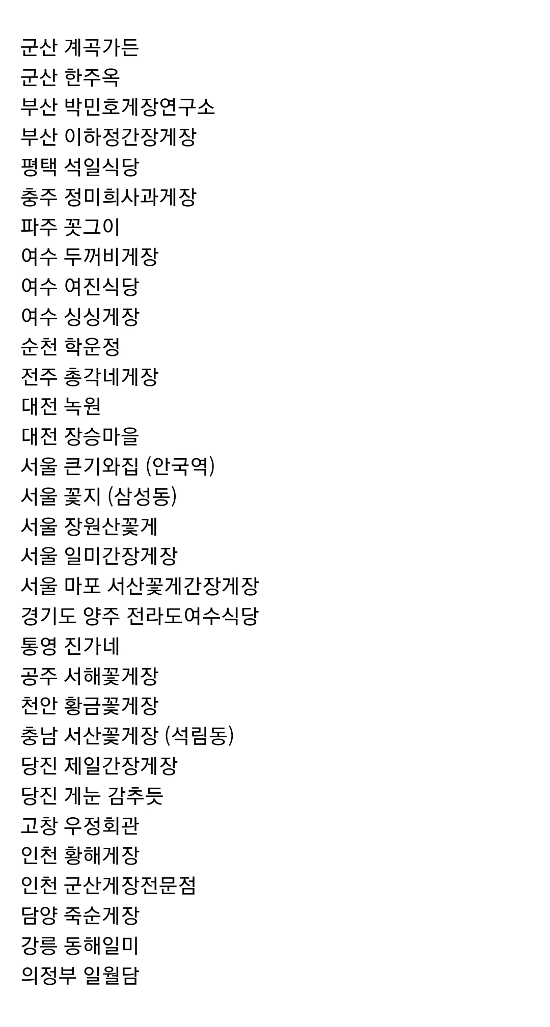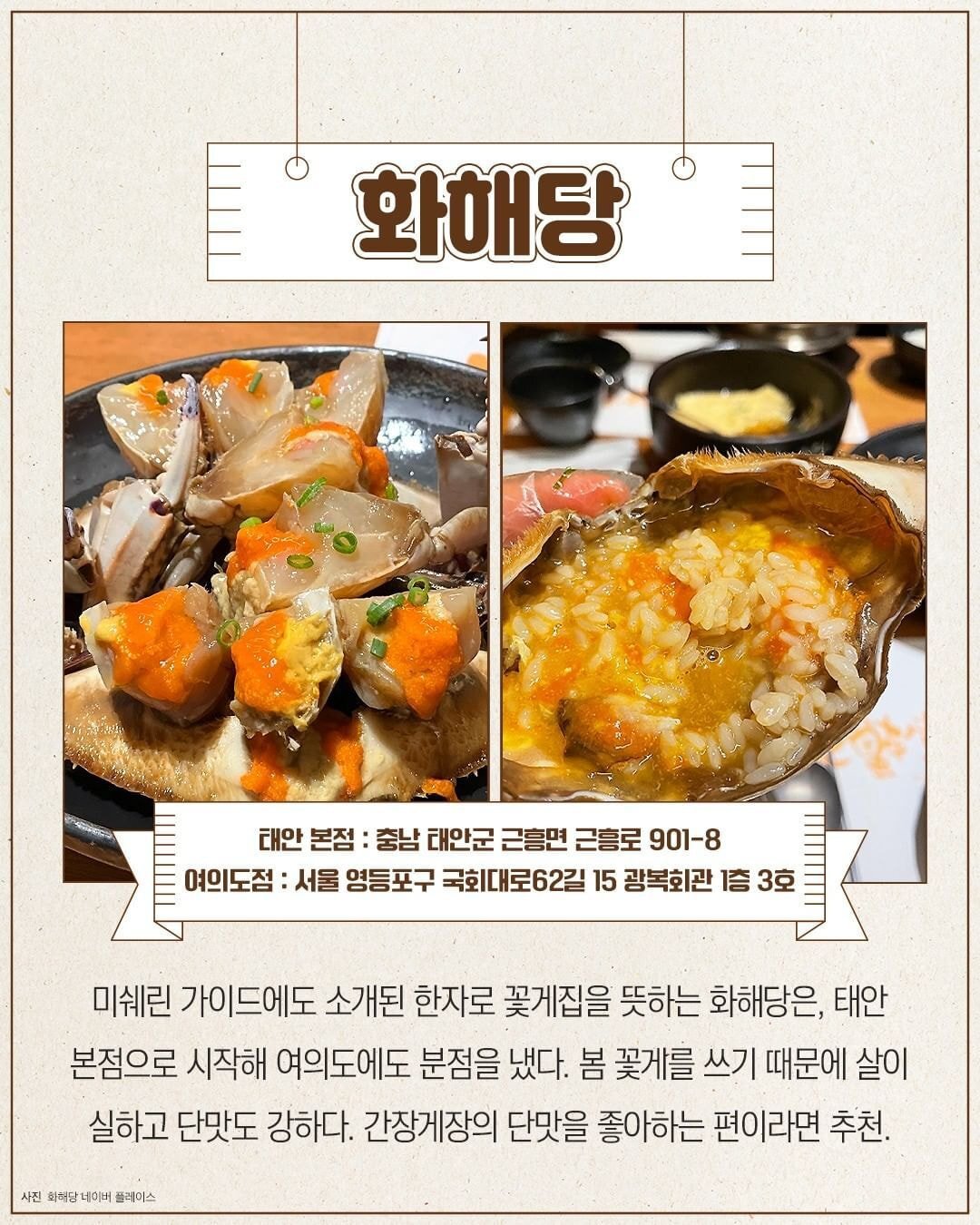 [스크랩] [흥미돋]전국 간장게장 맛집 6 작성자flflf|작성시간23.01.08|조회수27,956 목록 댓글 64 글자크기 작게가 글자크기 크게가 + 다음검색 스크랩 원문 : 도탁스 (DOTAX) 현재 게시글 추가 기능 열기 북마크 공유하기 신고 센터로 신고 댓글 댓글 64 댓글쓰기 답글쓰기 댓글 리스트 작성자물도 베이뜨야 | 작성시간 23.01.08 군산은 유성가든 맛있어ㅜ 작성자괄괄이 | 작성시간 23.01.08 군산 계곡가든 초심잃었음.... 작성자연금복권1등될여시 | 작성시간 23.01.08 난 꽃돌 별로였어.. 작성자쿠쿠루삥뿡 | 작성시간 23.01.08 꽃돌진짜 개맛있음 돌아버여 이것만 먹으러 여수 가도 충분 작성자맹렬그잡채 | 작성시간 23.01.08 의정부 일월담 가면 대통령부터 온갖 정치유명인 인증샷 다있음 여기 찐이야 댓글 전체보기