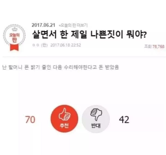 [칵.cxxxx]살면서 한 제일 나쁜 짓이 뭐야? 작성자( 본인 닉네임)|작성시간23.01.09|조회수8,189 목록 댓글 29 글자크기 작게가 글자크기 크게가 출처 : 여성시대 ( 본인 닉네임) 다음검색 현재 게시글 추가 기능 열기 북마크 공유하기 신고 센터로 신고 댓글 댓글 29 댓글쓰기 답글쓰기 댓글 리스트 작성자WATER | 작성시간 23.01.09 아니 좀 ㅅㅂ 진짜 인생똑바로살아 ㅠ 작성자연금복권온오프1등 | 작성시간 23.01.09 악마같은 새끼... 작성자서프라이즈비밀의방 | 작성시간 23.01.09 와 진심 악마야 뭐야… 작성자동그란누렁이냄새 | 작성시간 23.01.09 샤따내린다.. 미친새끼.. 작성자가을 한 장 | 작성시간 23.01.10 ㅋㅋㅋㅋ진짜 가지가지한다진짜 댓글 전체보기