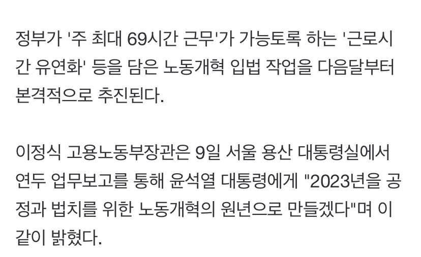 [여시뉴스데스크]'주 최대 69시간' 근로시간 유연화 내달부터 입법추진 작성자뷰리풀럽|작성시간23.01.09|조회수2,700 목록 댓글 47 글자크기 작게가 글자크기 크게가 출처 : https://n.news.naver.com/mnews/article/087/0000945919?sid=100'주 최대 69시간' 근로시간 유연화 내달부터 입법추진정부가 '주 최대 69시간 근무'가 가능토록 하는 '근로시간 유연화' 등을 담은 노동개혁 입법 작업을 다음달부터 본격적으로 추진된다. 이정식 고용노동부장관은 9일 서울 용산 대통령실에서 연두n.news.naver.com전문 출처로 다음검색 현재 게시글 추가 기능 열기 북마크 공유하기 신고 센터로 신고 댓글 댓글 47 댓글쓰기 답글쓰기 댓글 리스트 작성자빅피처S2 | 작성시간 23.01.09 소름끼쳐 진짜 작성자그린티프라푸치노휘핑빼고 | 작성시간 23.01.09 포괄임금제인 나는 최저시급 줄이고 연장수장 늘려서 또 토요일 근무 시키겠네... 작성자사과도마도귤 | 작성시간 23.01.09 정녕..? 작성자왜그러고살어 | 작성시간 23.01.10 딱 숨만 쉬고 먹고 살게만 만들어서 가축화 시키려는게 너무 티난다 ㅎㅎㅎ 작성자최정원 | 작성시간 23.01.10 미친 댓글 전체보기