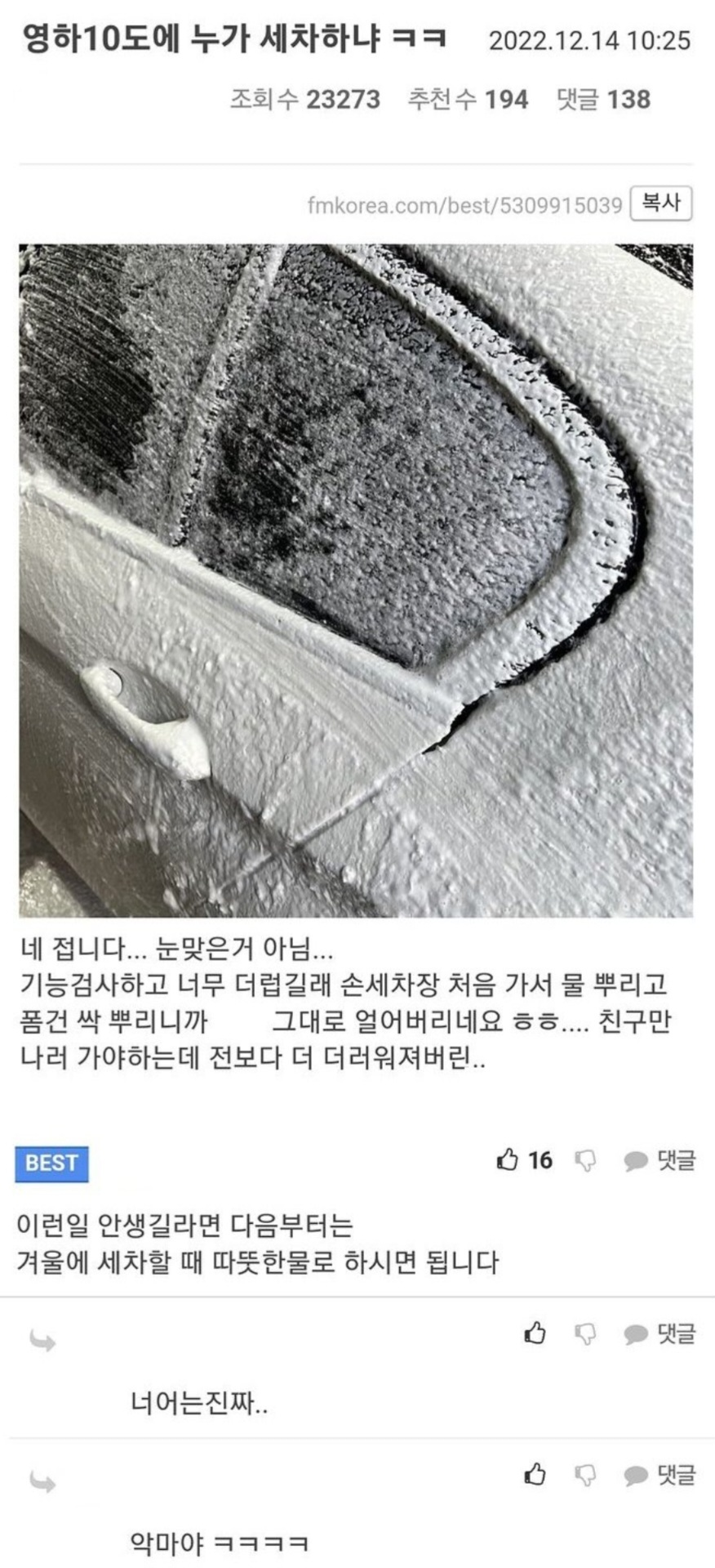 근데물뿌리면 흘러내려가긴해ㅋㅋㅋ단지 뿌린 물도 좀 얼더라고ㅋㅋㅋㅋㅋㅋㅋㅋ 사이드미러에 고드름 달고 운전함ㅋㅋㅋ