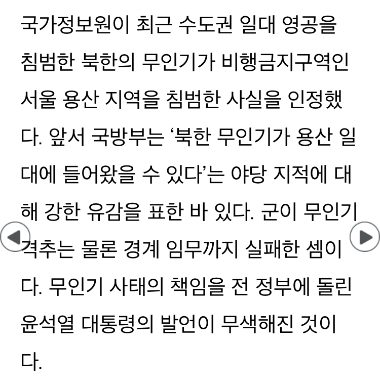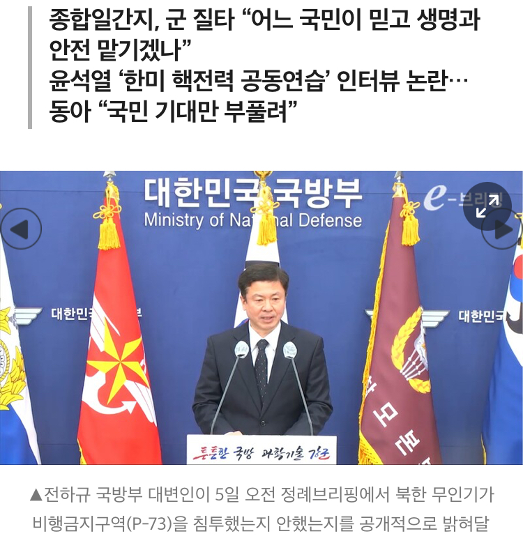 [여시뉴스데스크]용산 뚫은 북한 무인기에 무능 비판 쏟아지는데 전 정권 탓이라는 신문은 작성자남현지|작성시간23.01.10|조회수1,749 목록 댓글 8 글자크기 작게가 글자크기 크게가 출처 : http://www.mediatoday.co.kr/news/articleView.html?idxno=307811[아침신문 솎아보기] 용산 뚫은 북한 무인기에 무능 비판 쏟아지는데 전 정권 탓이라는 신문은 - 국가정보원이 최근 수도권 일대 영공을 침범한 북한의 무인기가 비행금지구역인 서울 용산지역을 침범한 사실을 인정했다. 앞서 국방부는 ‘북한 무인기가 용산 일대에 들어왔을 수 있다’는 www.mediatoday.co.kr 다음검색 현재 게시글 추가 기능 열기 북마크 공유하기 신고 센터로 신고 댓글 댓글 8 댓글쓰기 답글쓰기 댓글 리스트 작성자윤석열제발길가다벼락맞아죽게해줘라 | 작성시간 23.01.10 용산 비우면서 청와대 지하벙커 위치 알려주고, 어거지로 국방부 이전시켜서 안보 공백 만든 게 누군데 전정권탓을 하냐. 작성자lily_ | 작성시간 23.01.10 조선일보 ㅋ 작성자수르수르만만 | 작성시간 23.01.10 현대통령은 없는가…전대통령탓 저렇게 많이하는 정권 첨봄 작성자mhtyhrymleef | 작성시간 23.01.10 무정부시대라 그러니?? 작성자나솔모솔특집존잼 | 작성시간 23.01.10 진짜 존나 쳐맞아야해 댓글 전체보기