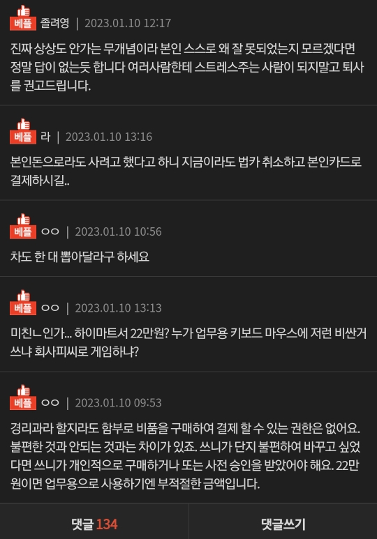 작성자푸르른 하늘 소다맛 작성시간 23.01.11 나는 사무실꾸미기 좋아해서...그냥 쫌쫌따리 여유될때마다 키보드 마우스 하나하나씩 내가 사서 바리바리 들고오는데...나도 경리로 일하지만 저게 되나?숨겨질 수도 없는일인데 법인카드를...?간크다...그냥 당장 안들킨다고 한거잖아...