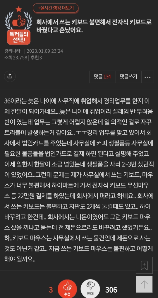 회사에서 쓰는 키보드 불편해서 전자식 키보드로 바꿨다고 혼났어요.