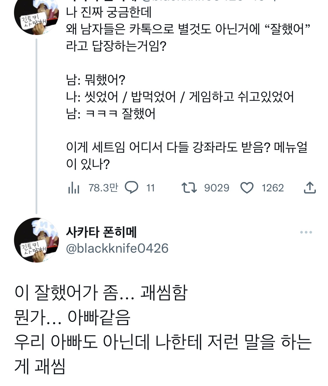 작성자마루는강아쥐 작성시간 23.01.12 ㅅㅂ ㄹㅇ 누가 나 일한거 가지고 기특하다고해서 개지랄한적도 있음 지가뭔데 아빠냐?