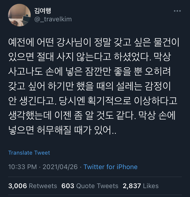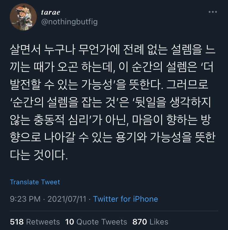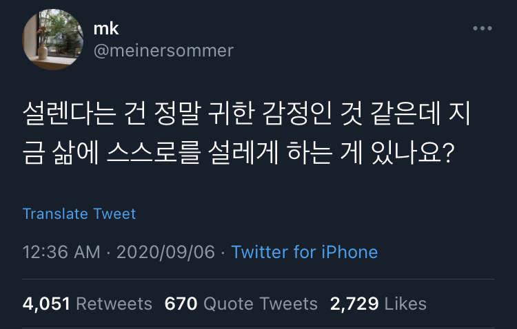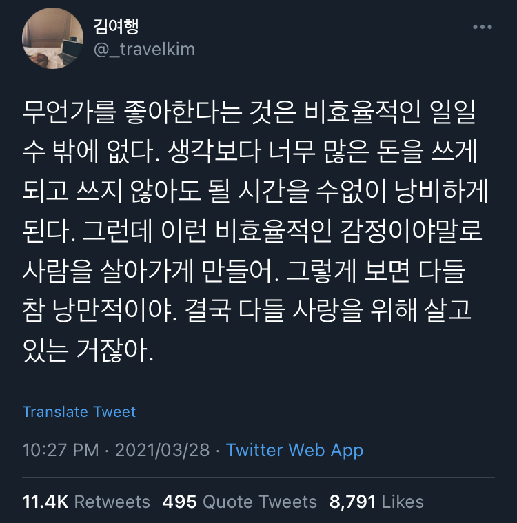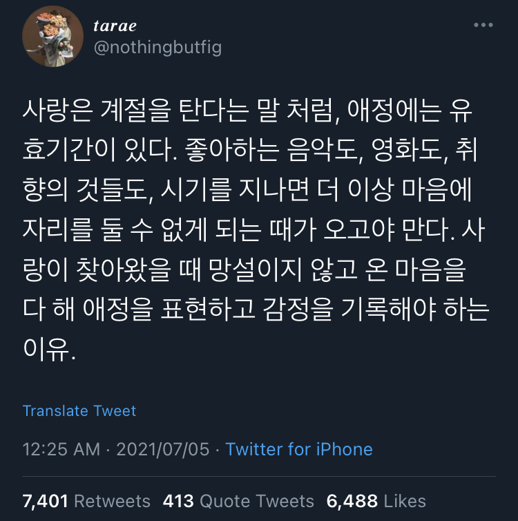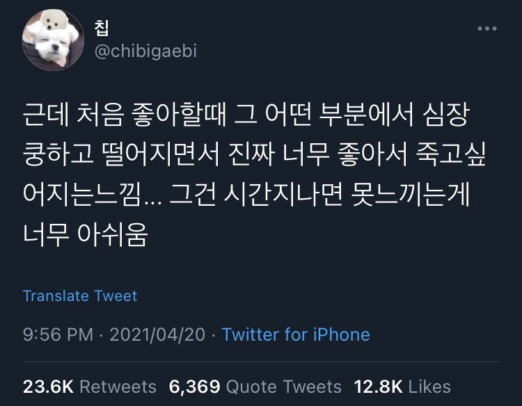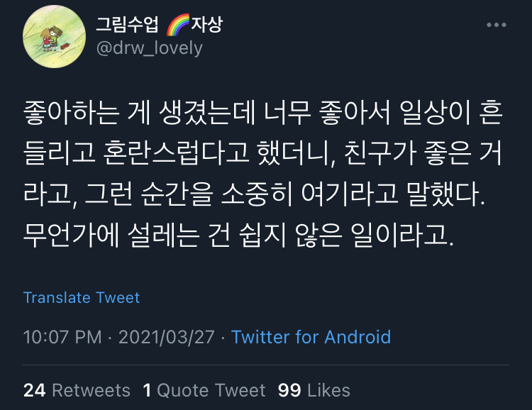[스크랩] [흥미돋]지금 삶에 스스로를 설레게 하는 게 있나요?.twt 작성자티나티|작성시간23.01.13|조회수5,557 목록 댓글 9 글자크기 작게가 글자크기 크게가 출처 : https://cafe.daum.net/Tlwkftlqkftlldlqkf/8vJr/2970351차 출처 사진속2차 출처 다음카페 밀리토리네 다음검색 스크랩 원문 : *여성시대* 차분한 20대들의 알흠다운 공간 현재 게시글 추가 기능 열기 북마크 공유하기 신고 센터로 신고 댓글 댓글 9 댓글쓰기 답글쓰기 댓글 리스트 작성자라로리로 | 작성시간 23.01.14 요즘 너무 사는데만 지쳐서ㅠ 나도 설레고싶다~굳이 사랑이 아니여도 그게 일이여도 좋으니ㅠ 작성자광야를걷고있는그대에게 | 작성시간 23.01.14 난 내 일이 설레서 너무 좋아일하는게 설렌다니 복 받았어 작성자Beyourself, | 작성시간 23.01.14 설레고싶다 작성자IBK_김희진 | 작성시간 23.01.14 나 이런 트위터 감성 좋아하네.. 작성자아몬드 쿠키 | 작성시간 23.01.14 설레고 싶다 댓글 전체보기