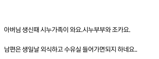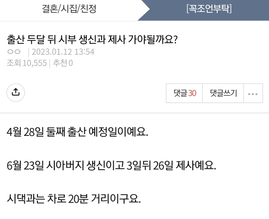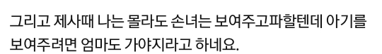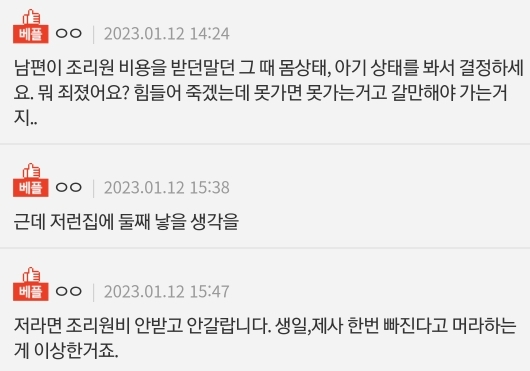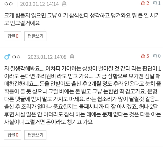작성자유자나무 작성시간 23.01.14 조리원비 받고 제사 가지말고 배째라하면? 애가 둘인데 어찌 가 애땜에 못간다고 애핑계 대고 집에 있자