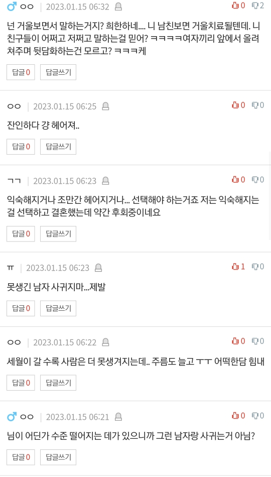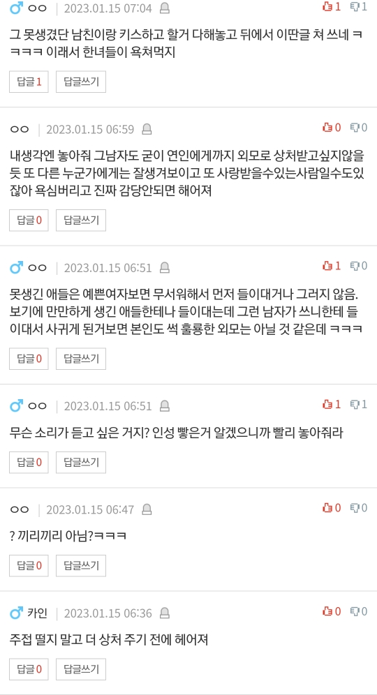 작성자너뉘귀야 작성시간 23.01.16 못생긴놈이랑 사귀는게 사랑이지 이 자댕이들아 콱씨 삼일한으로 맞아야지 저런말이 안나오지